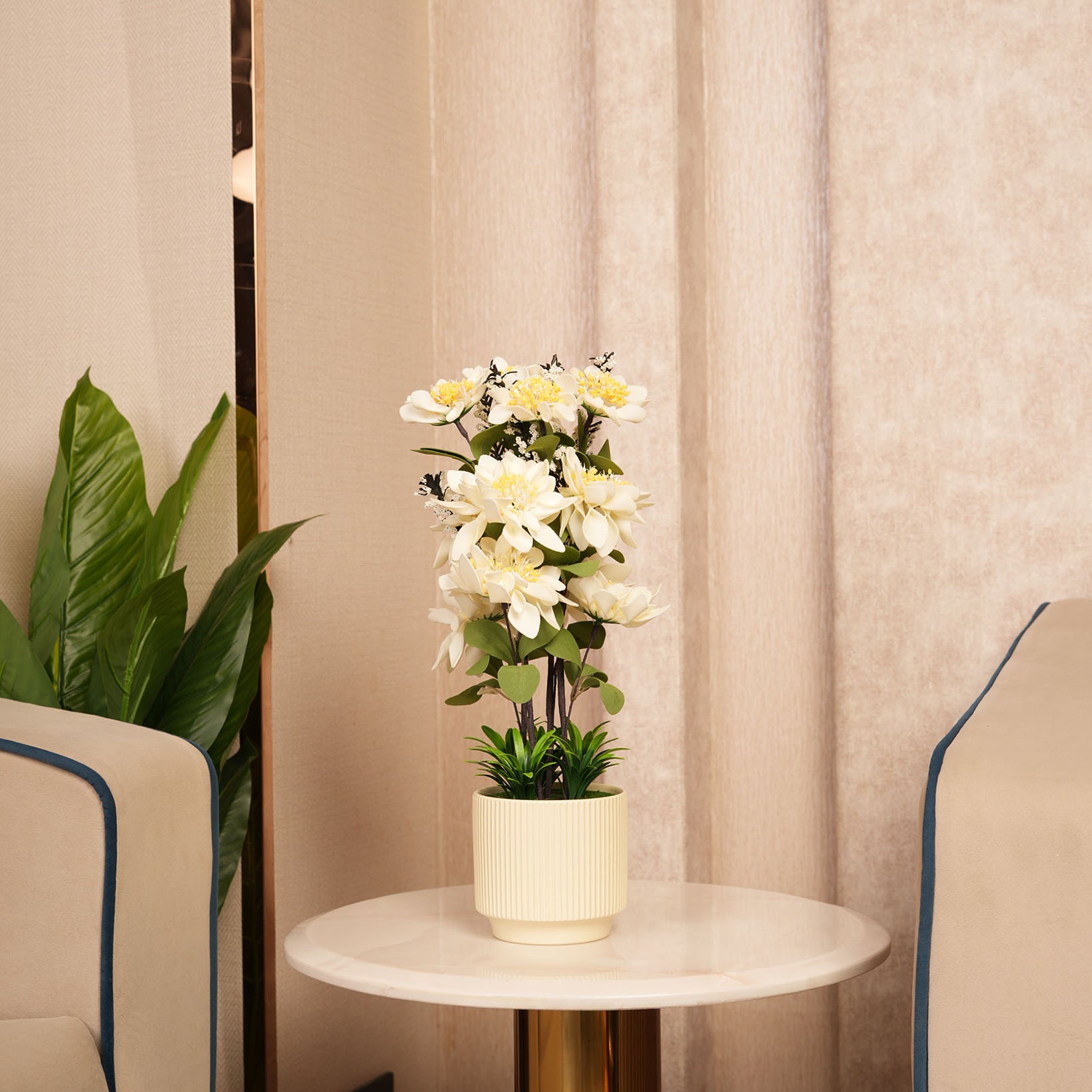 Bring timeless elegance to your space with this beautifully crafted artificial dahlia-inspired flower arrangement. Featuring soft White blooms with textured yellow centers and lush green foliage, it adds a fresh and vibrant touch to any room. Perfect for home décor, office desks, or gifting, this maintenance-free floral piece brightens your surroundings with effortless beauty every day.