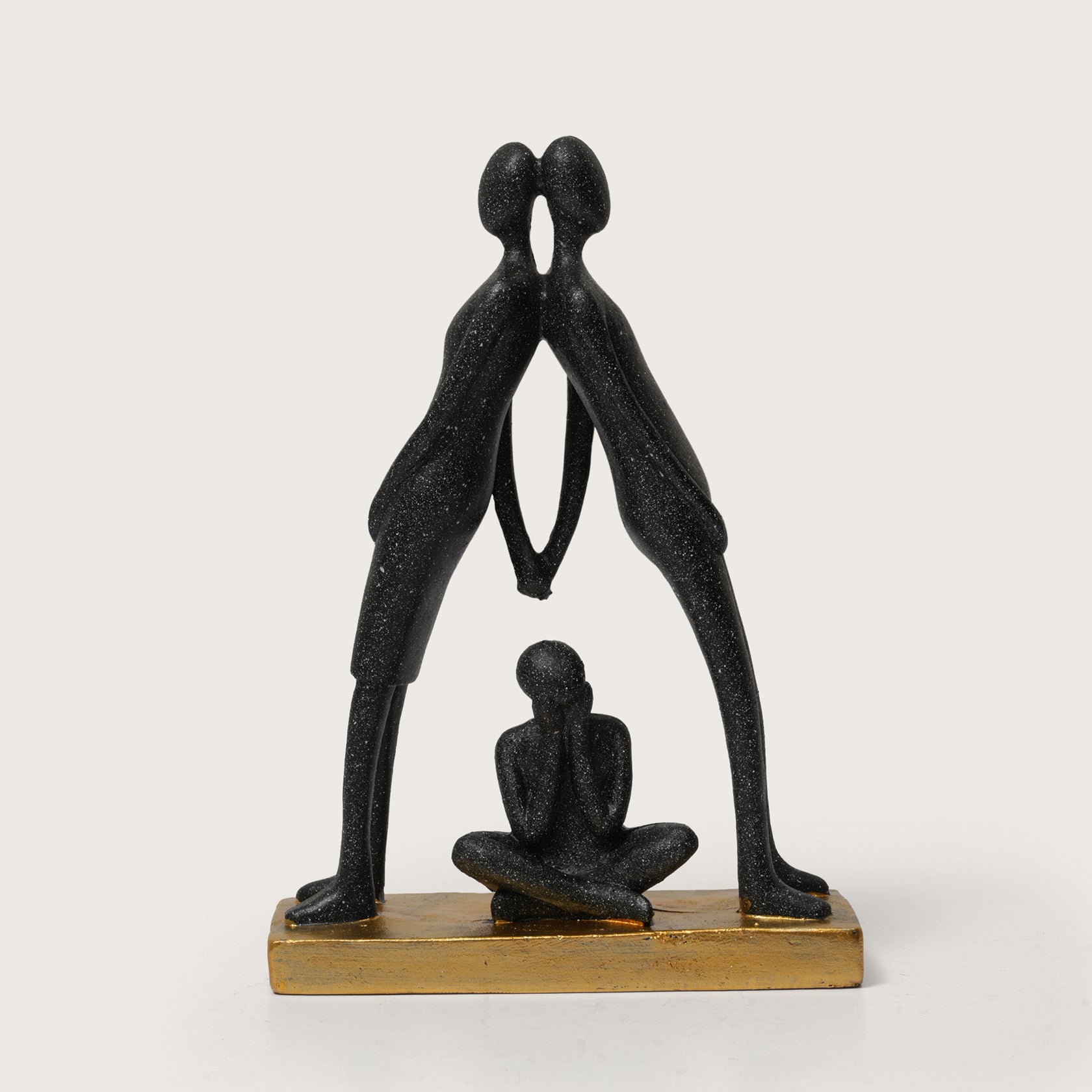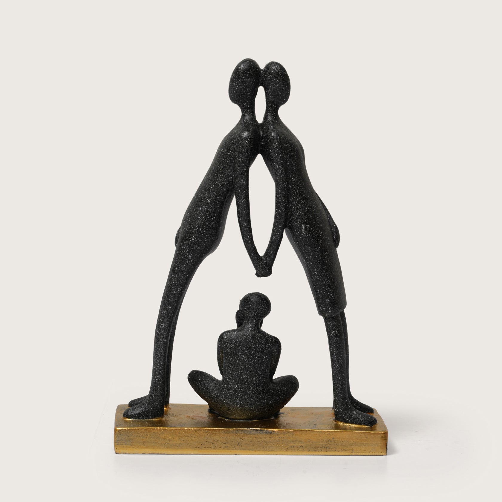 This poignant abstract piece beautifully captures the essence of family protection. Two tall, speckled black figures form a comforting arch over a child figure seated securely below. Resting on a warm, golden base, this sculpture creates a powerful visual statement. An elegant and meaningful gift symbolizing love, safety, and the family bond.