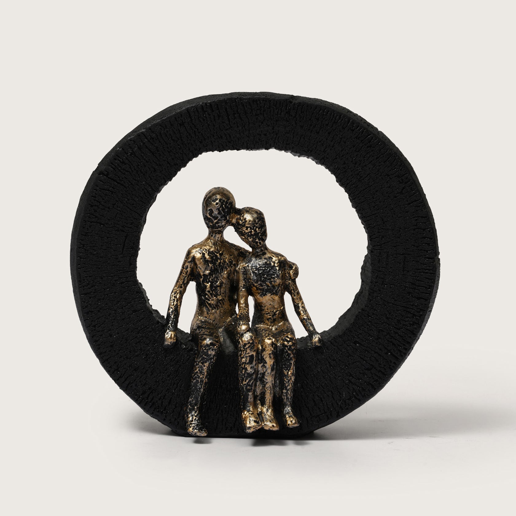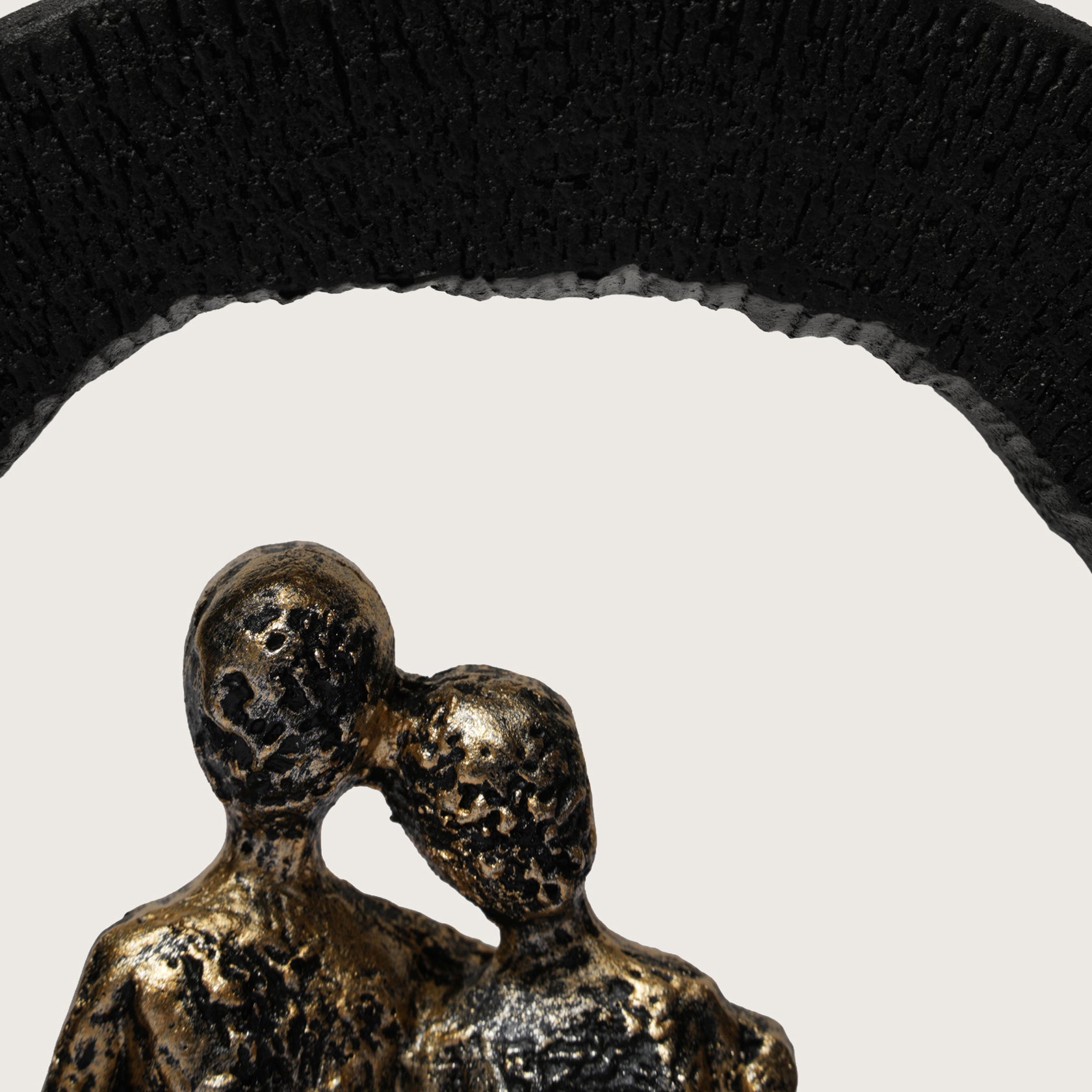 Celebrate connection with this striking piece. A gold-patina abstract couple sits intimately within a textured, black circular frame, symbolizing enduring love and protection. The contrast between the warm figures and the rough, dark ring creates a powerful focal point. Perfect for gifting or adding modern romance to any shelf or mantel.