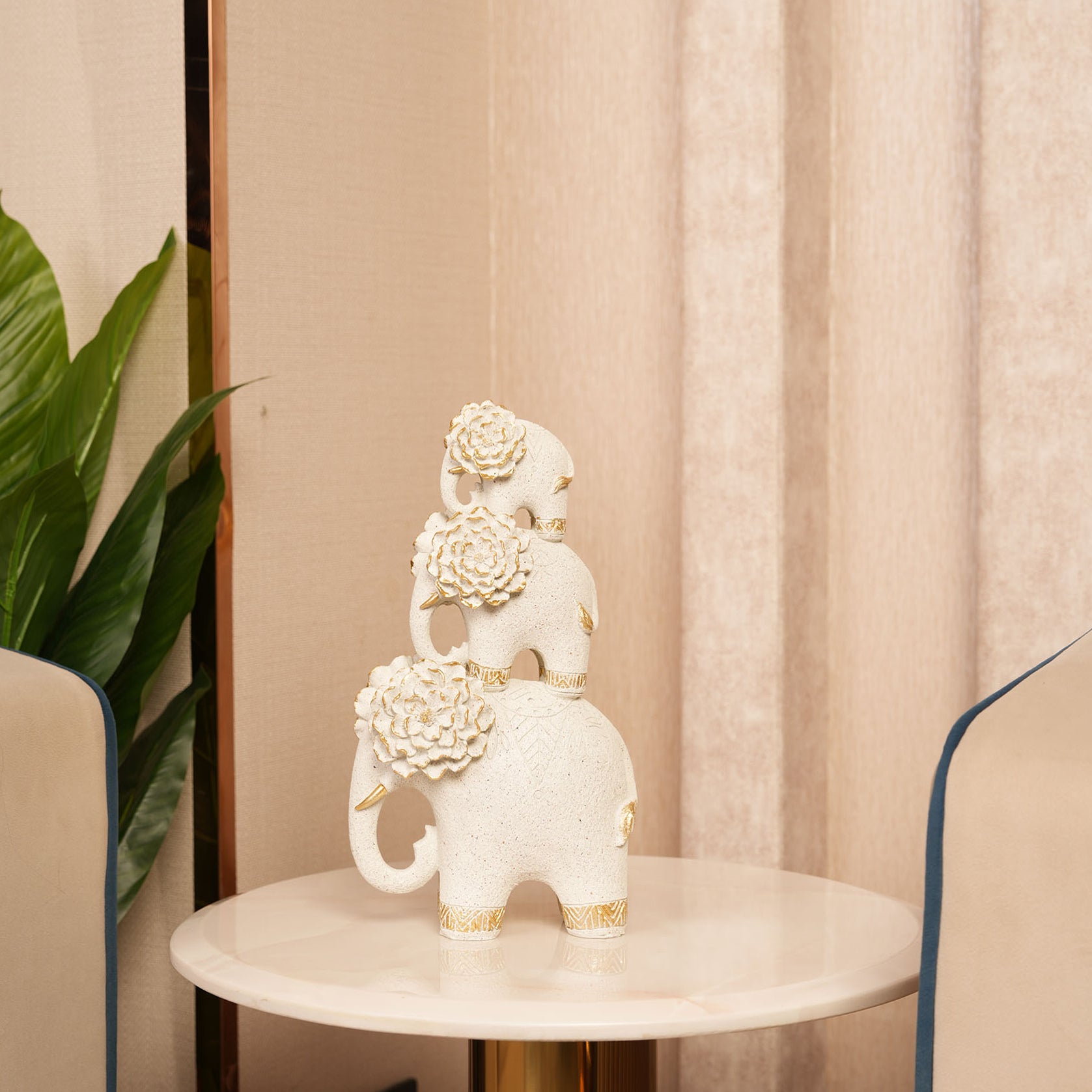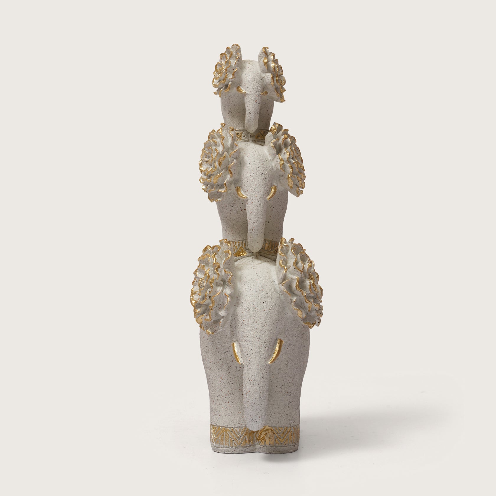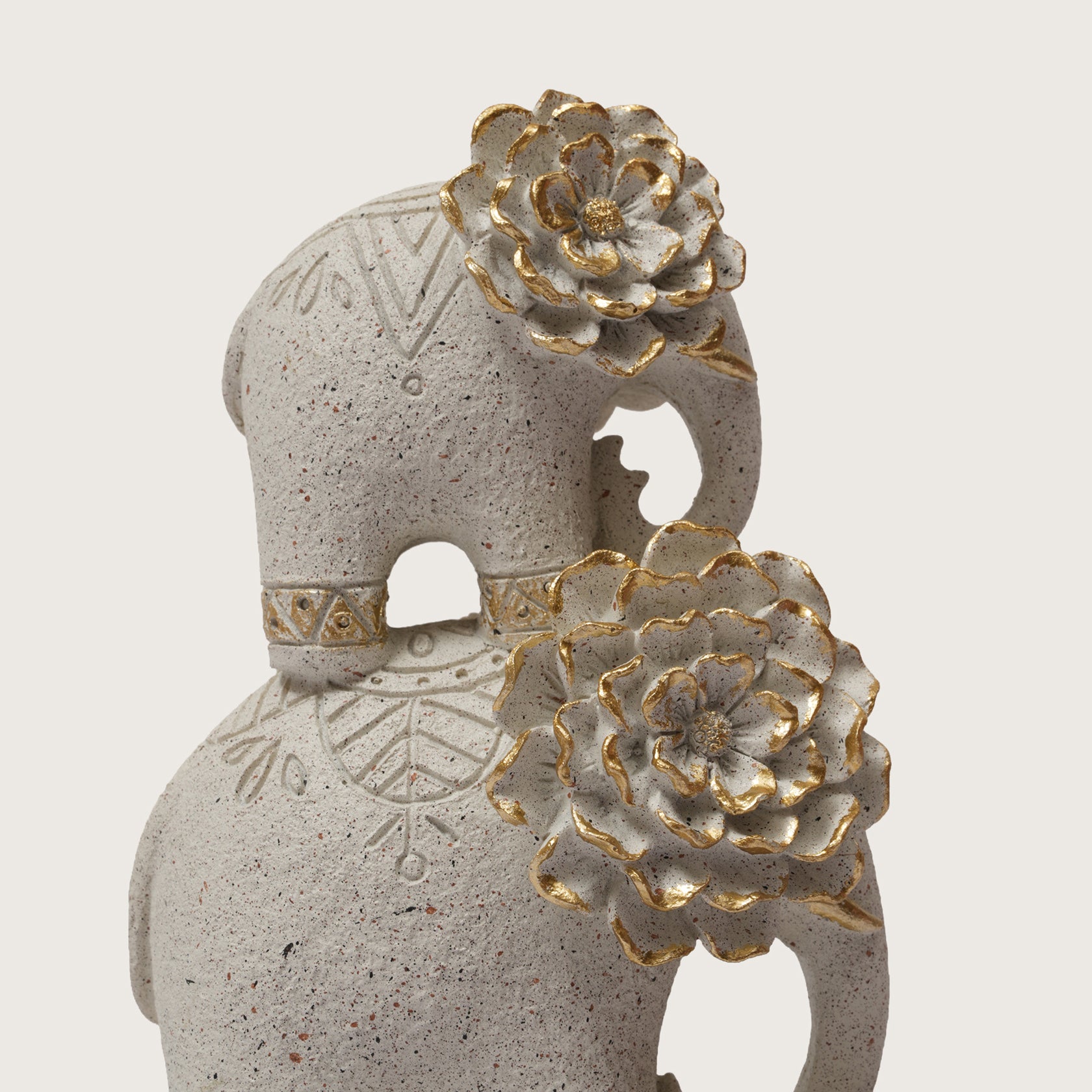 Celebrate prosperity and good fortune with this charming stacked elephant figurine. Crafted from speckled, neutral-toned ceramic, this sculpture features three elephants balanced vertically. Each elephant is adorned with intricate patterns and striking gold accents, including elaborate gilded lotus flowers. This detailed piece brings a beautiful bohemian or global-inspired touch to a mantle, console table, or shelf.