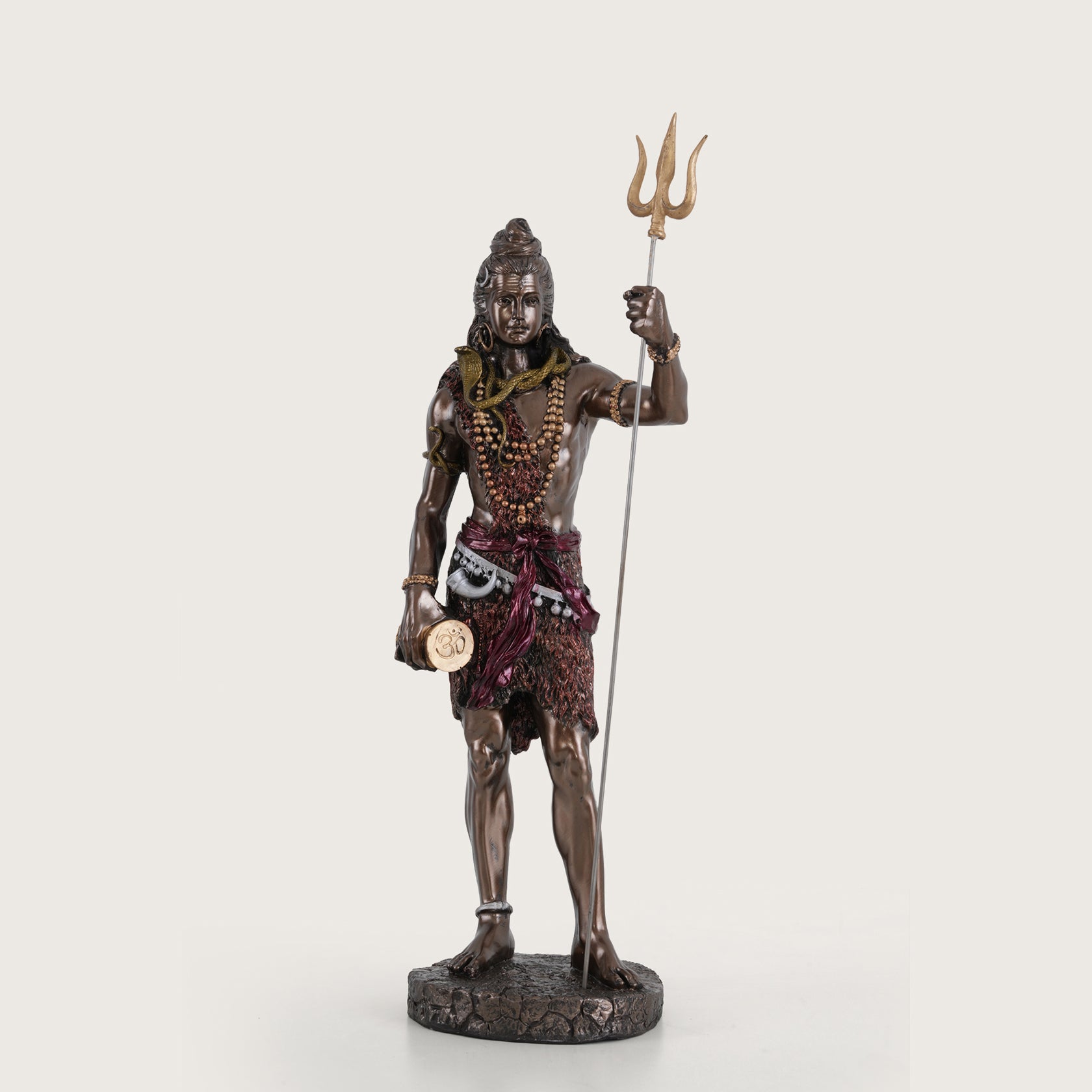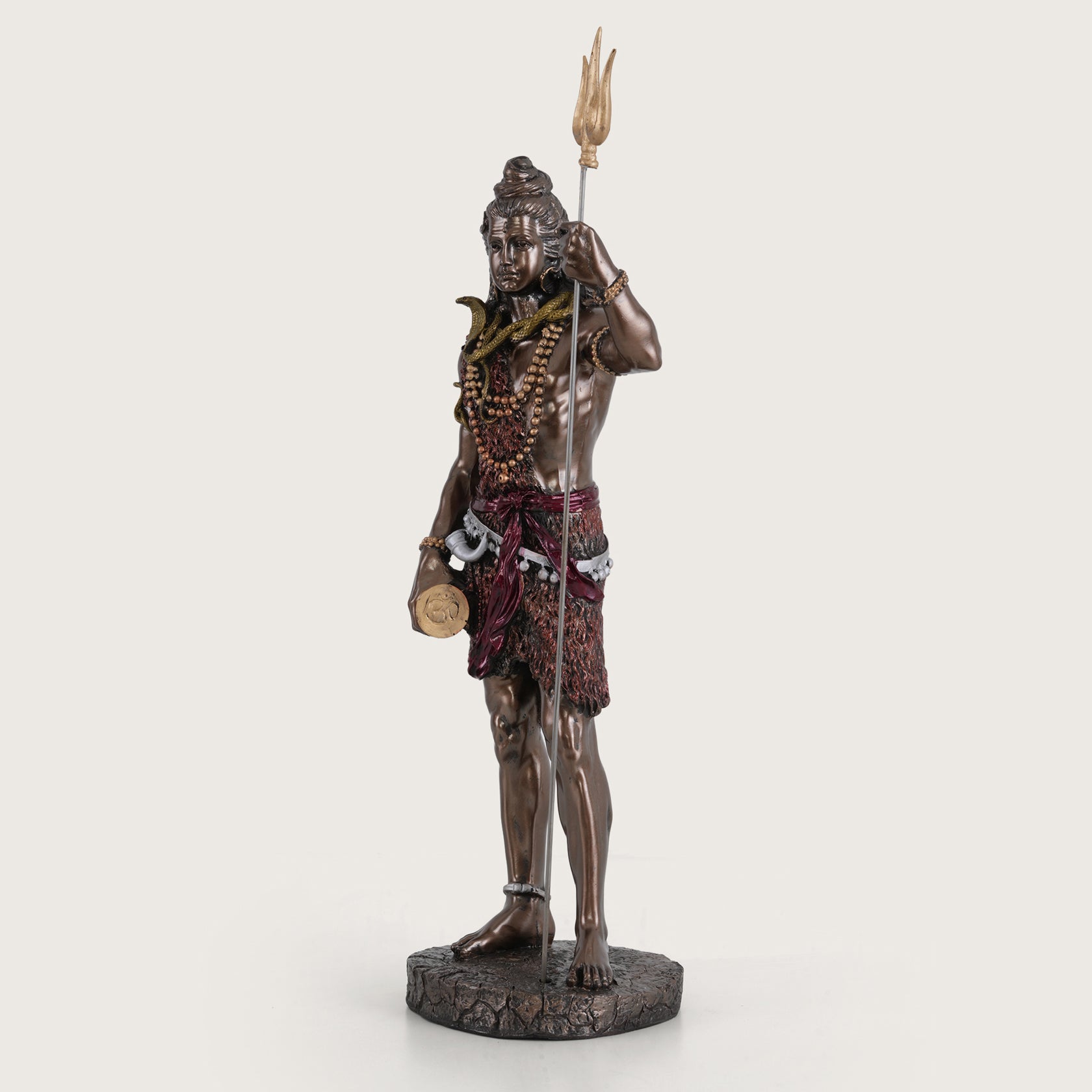 Bring a presence of divine strength and serenity into your space with this exquisitely crafted Lord Shiva figurine. Depicted in a majestic standing posture, Mahadev holds his iconic Trishul and Damru, symbolizing the cosmic rhythm and protection. The statue features a premium antique bronze finish with intricate hand-painted details on his attire and sacred ornaments. Perfect for a home altar, meditation room, or as a sophisticated office accent, this sacred idol serves as a powerful reminder of peace and transformation.