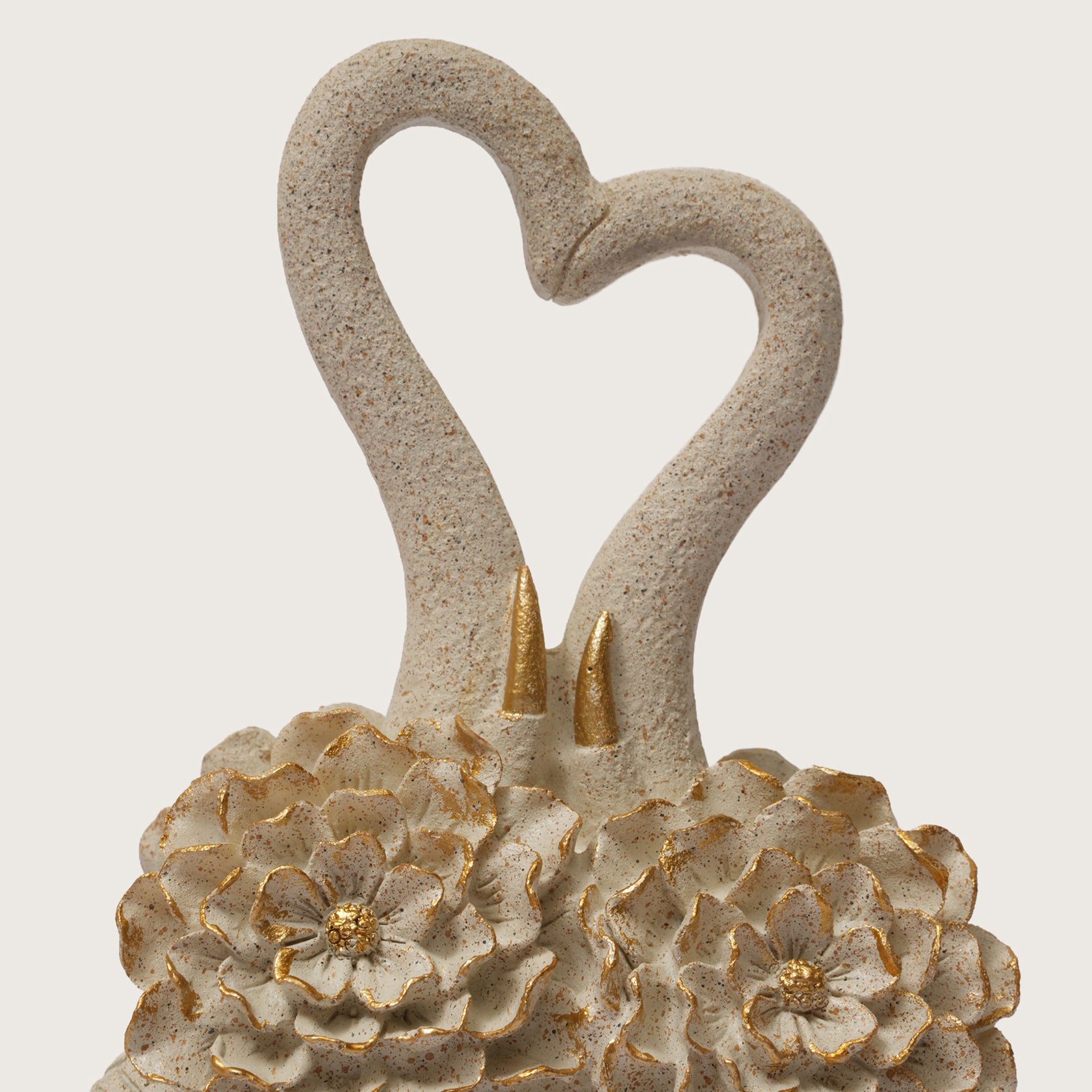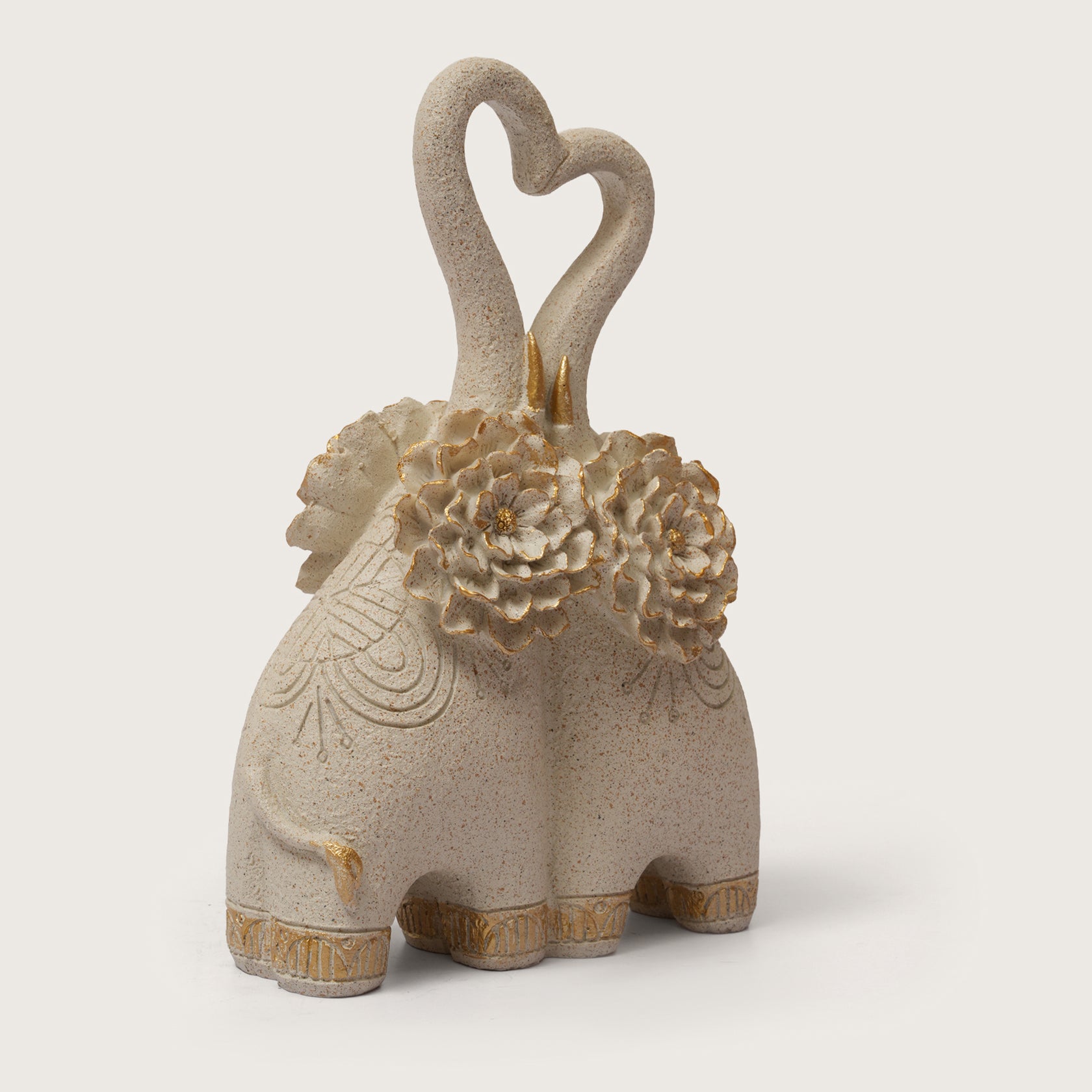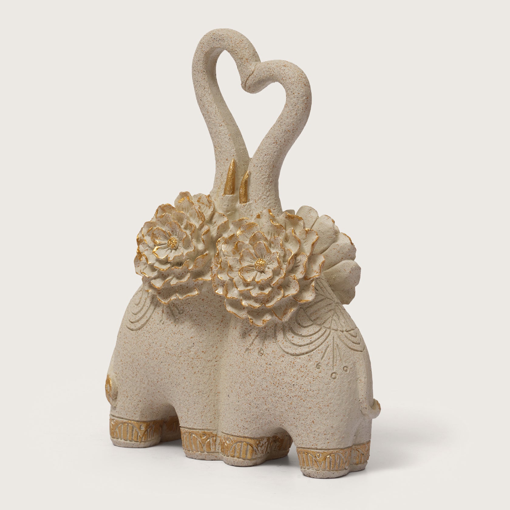 Celebrate eternal love with the Embracing Elephant Couple Heart Trunk Figurine. Crafted from speckled, neutral-toned ceramic, this touching sculpture features two elephants intertwined, their trunks forming a beautiful heart shape. The pair is embellished with intricate designs, golden accents, and two prominent gilded lotus flowers, symbolizing purity and devotion. This piece is a perfect, romantic accent for wedding décor, anniversaries, or a loved one's bookshelf.
