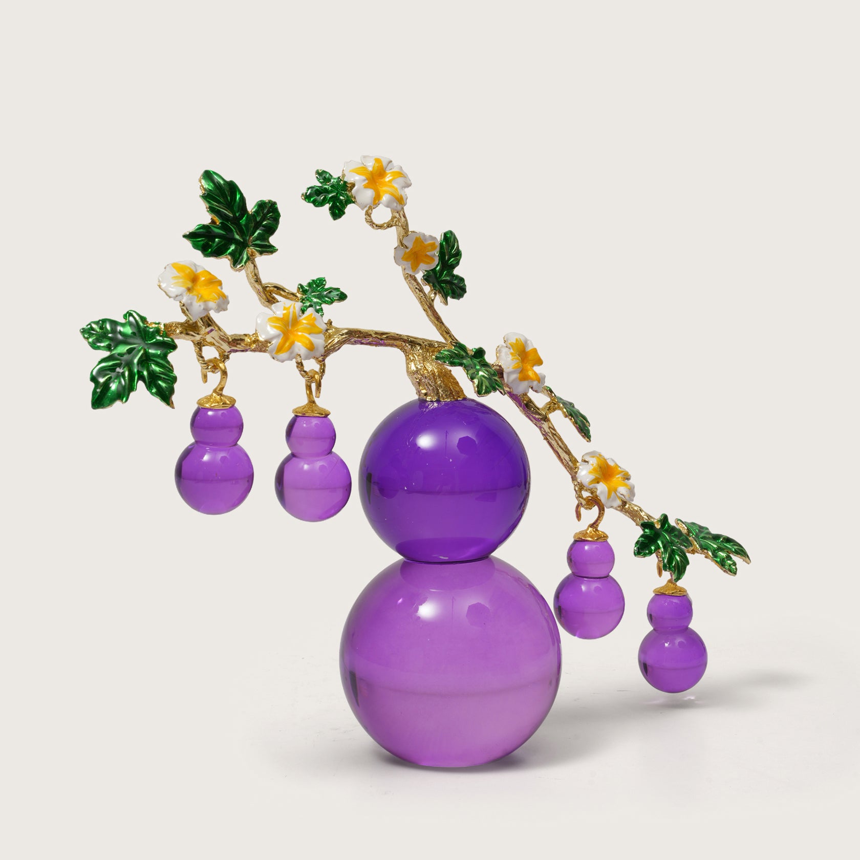 Introduce a pop of vibrant color with this Enamel Flower Showpiece with Glass Drops. A graceful, gold-tone metal branch is adorned with bright yellow and white enamel flowers and glossy green leaves. Suspended from the branch are deep purple glass beads and a central, stacked purple glass orb base. This artistic and imaginative figurine is a stunning, eye-catching accent for collectors and décor enthusiasts.