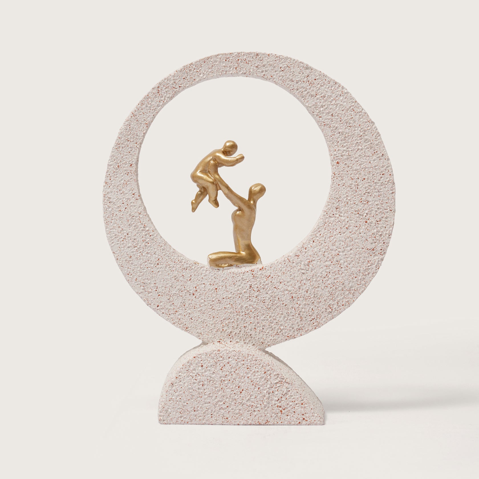 The dramatic visual impact comes from the contrast in textures and finishes. The parent and child are rendered in a smooth, rich metallic gold, making them the immediate focus. They are framed by a bold, crescent-shaped backing finished in a rugged, deep black and bronze texture, giving the entire piece an antique yet strikingly modern appeal.