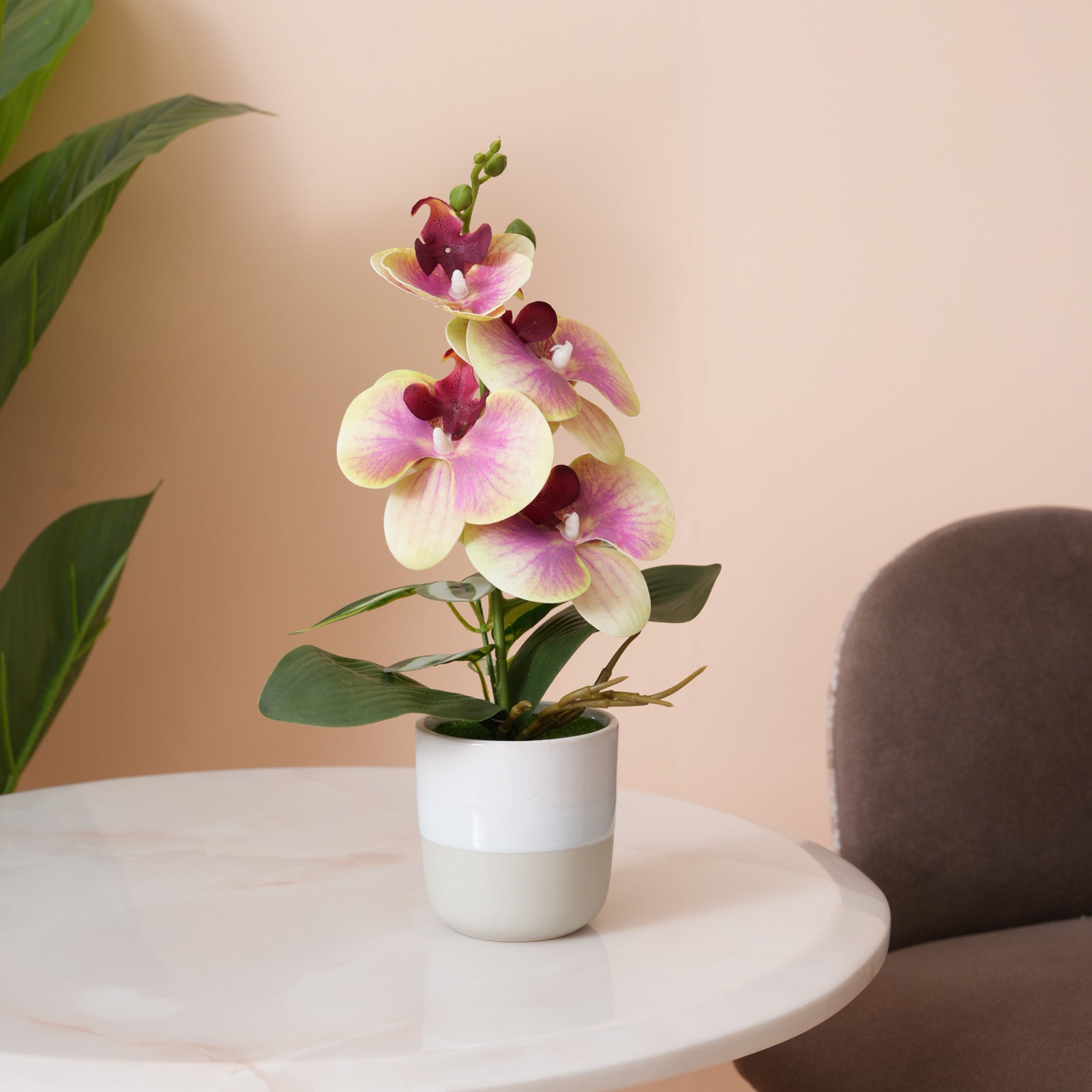 Elevate your decor effortlessly with this stunning Potted Phalaenopsis orchid. The magnificent flowers feature a beautiful blend of soft yellow and vibrant pink hues, accented by deep burgundy centers and rich green foliage. This striking arrangement is showcased in a unique three-tone ceramic pot, featuring stylish bands of indigo blue, pale grey, and white. It provides lasting, sophisticated color and natural elegance to any setting without requiring any upkeep.