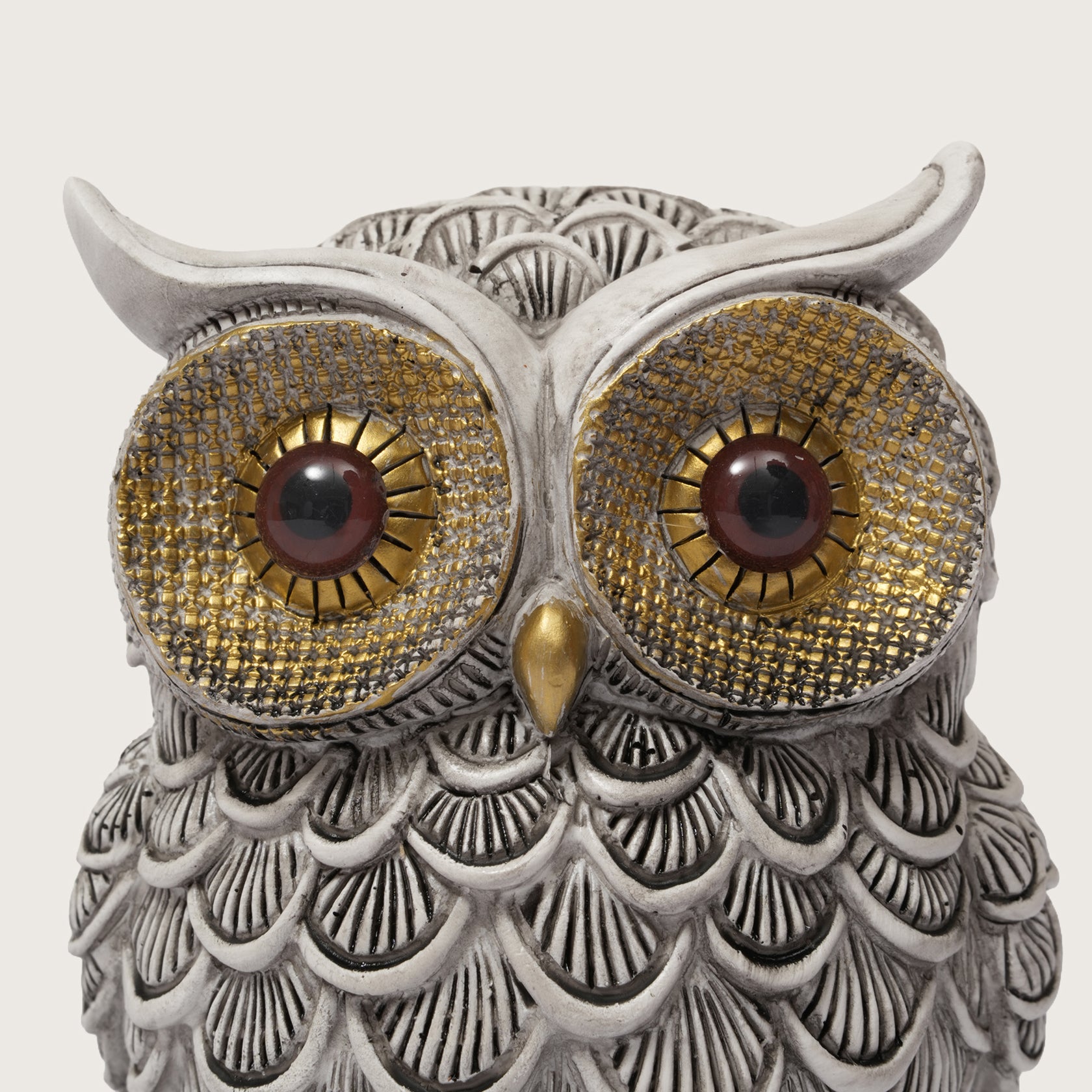 Introducing the HOME 360 Wisdom Owl, a sophisticated sculpture designed to bring an air of intellectual elegance to your home or office. Unlike standard figurines, this owl is defined by its extraordinary detailing. The body is meticulously sculpted to mimic overlapping, textured feathers, giving the piece a rich, almost hand-carved appearance.