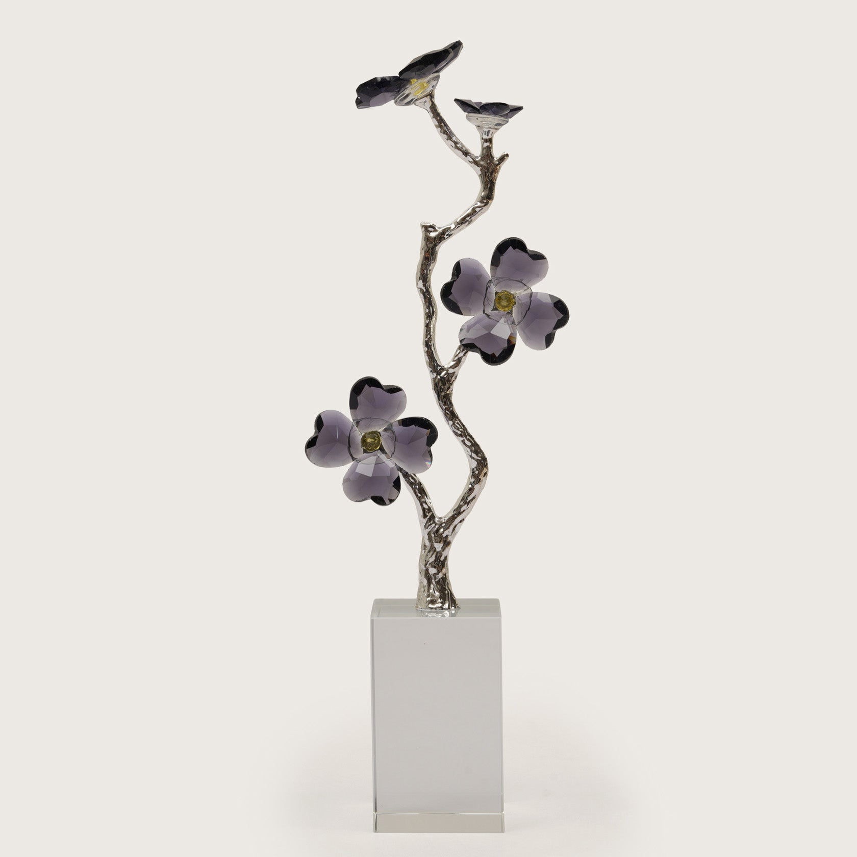 This stunning sculptural accent features amethyst-toned crystal dogwood blossoms and buds resting upon a realistic, textured silver-tone branch. The piece is elegantly supported by a substantial clear acrylic rectangular plinth. A beautiful accent for a desk or console, it brings year-round, glittering natural beauty to any luxurious space.