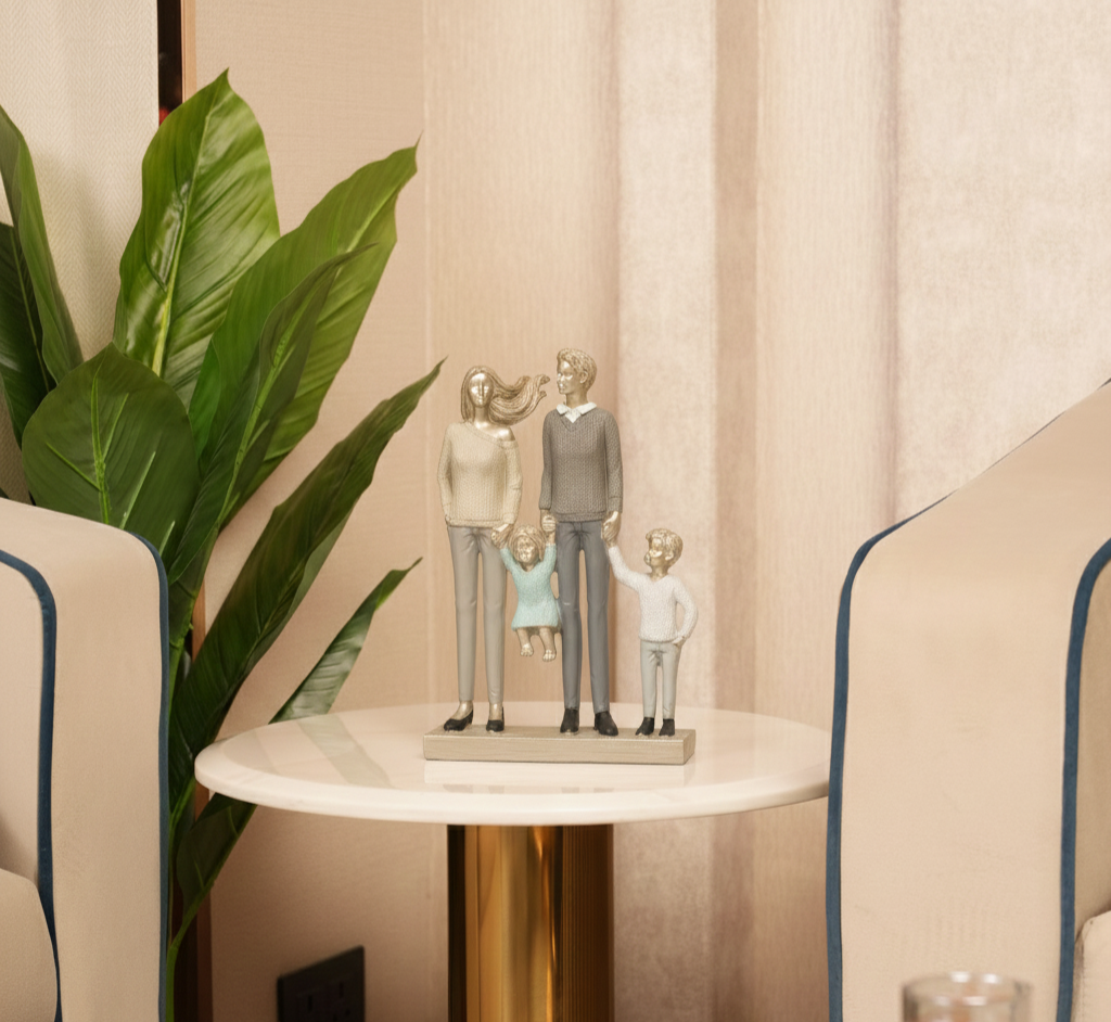 Celebrate family joy with this beautifully detailed sculpture of a mother, father, and two children. Notice the realistic textured sweaters and dynamic pose of the little girl swinging between her parents. Mounted on a wood-look base, this piece brings warmth and love to any shelf or mantel. An ideal and heartwarming gift for families.