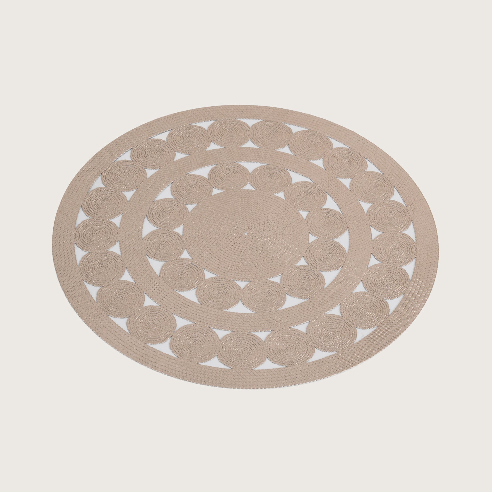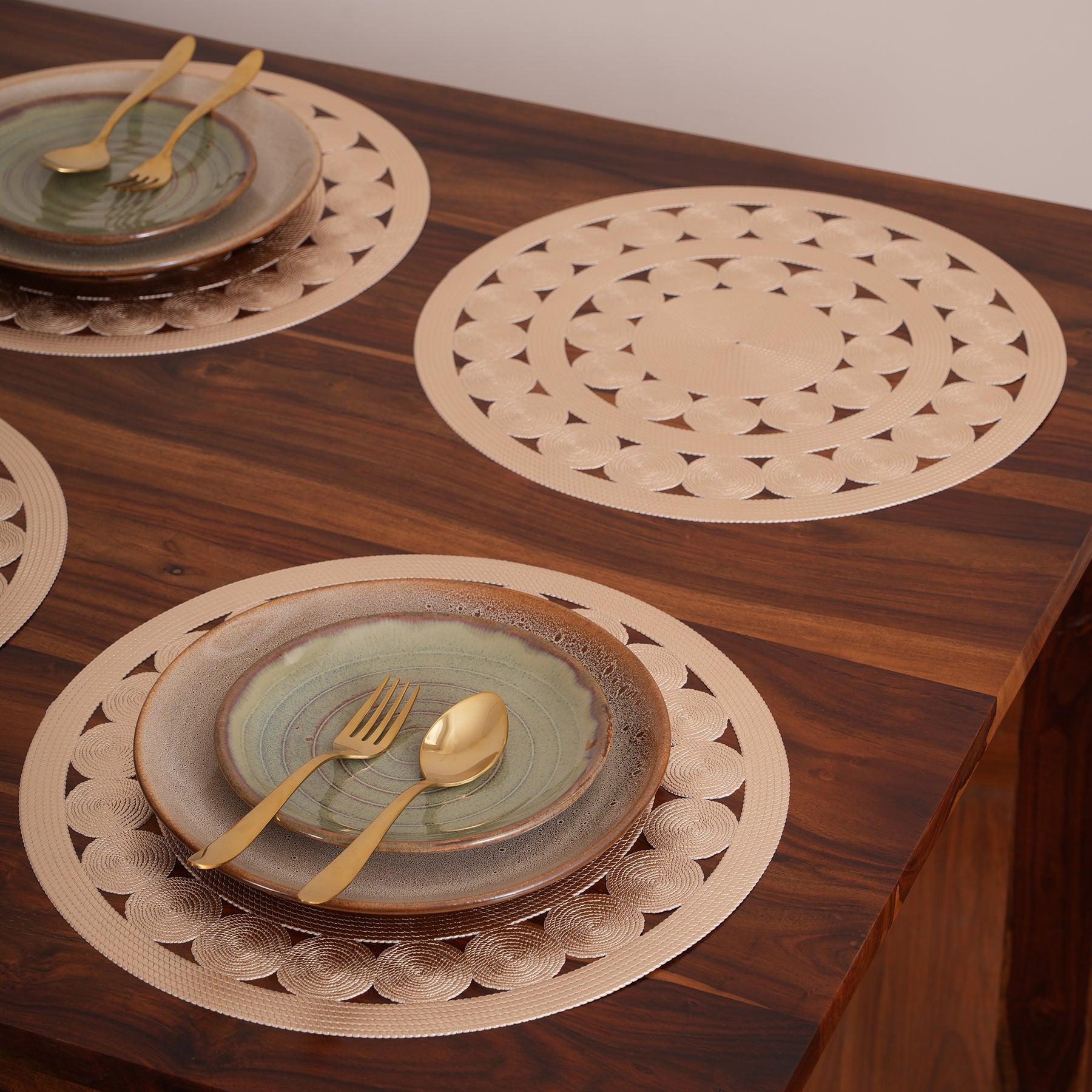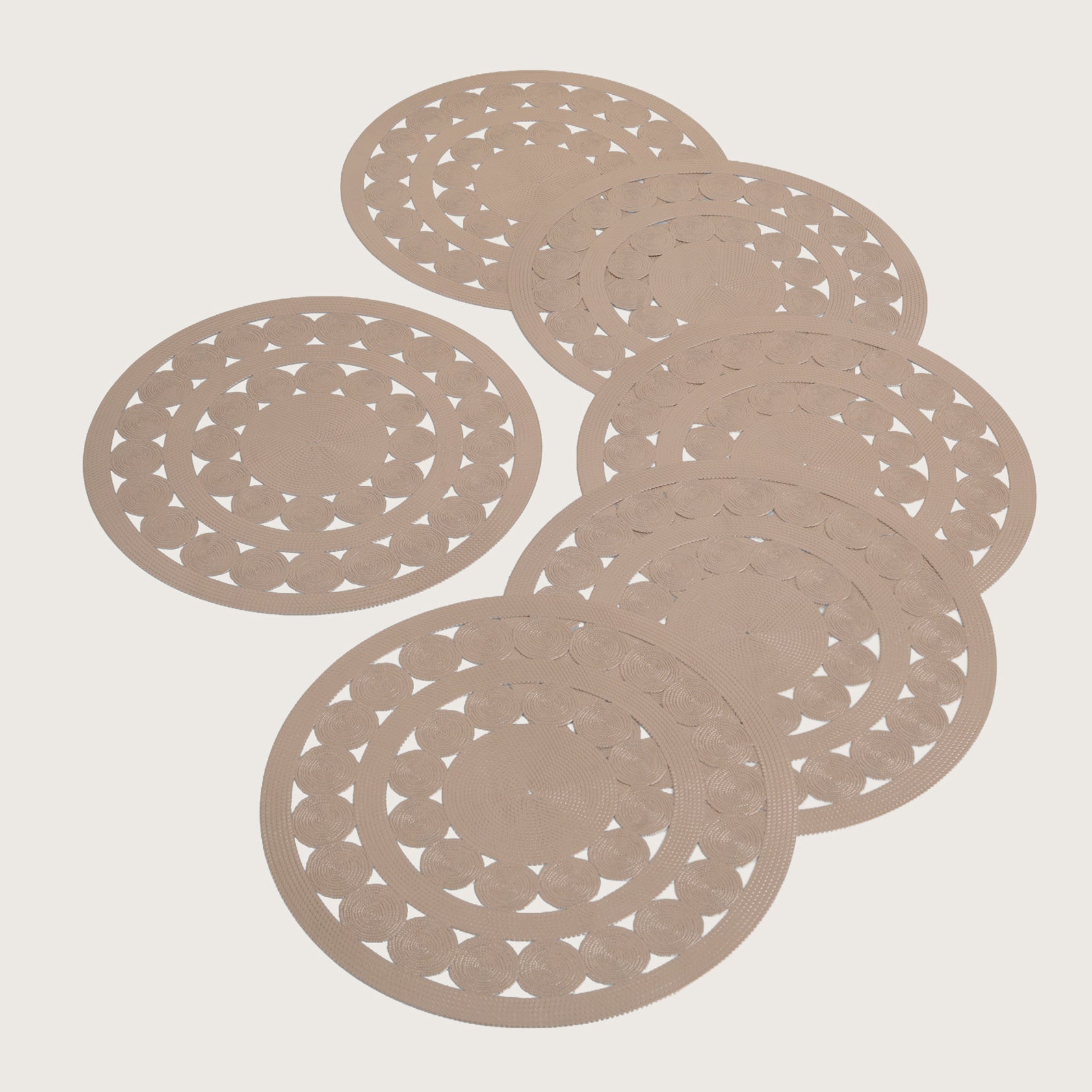Add a touch of natural elegance to your dining space with this set of 6 premium rose gold placemats, featuring an intricate Concentric circle design. Crafted from high-quality PVC, these durable mats offer excellent heat resistance and a non-slip surface to protect your table. Their stunning, washable, and delicate lace-like pattern makes them a perfect, low-maintenance choice for elevating everyday meals or special festive occasions.