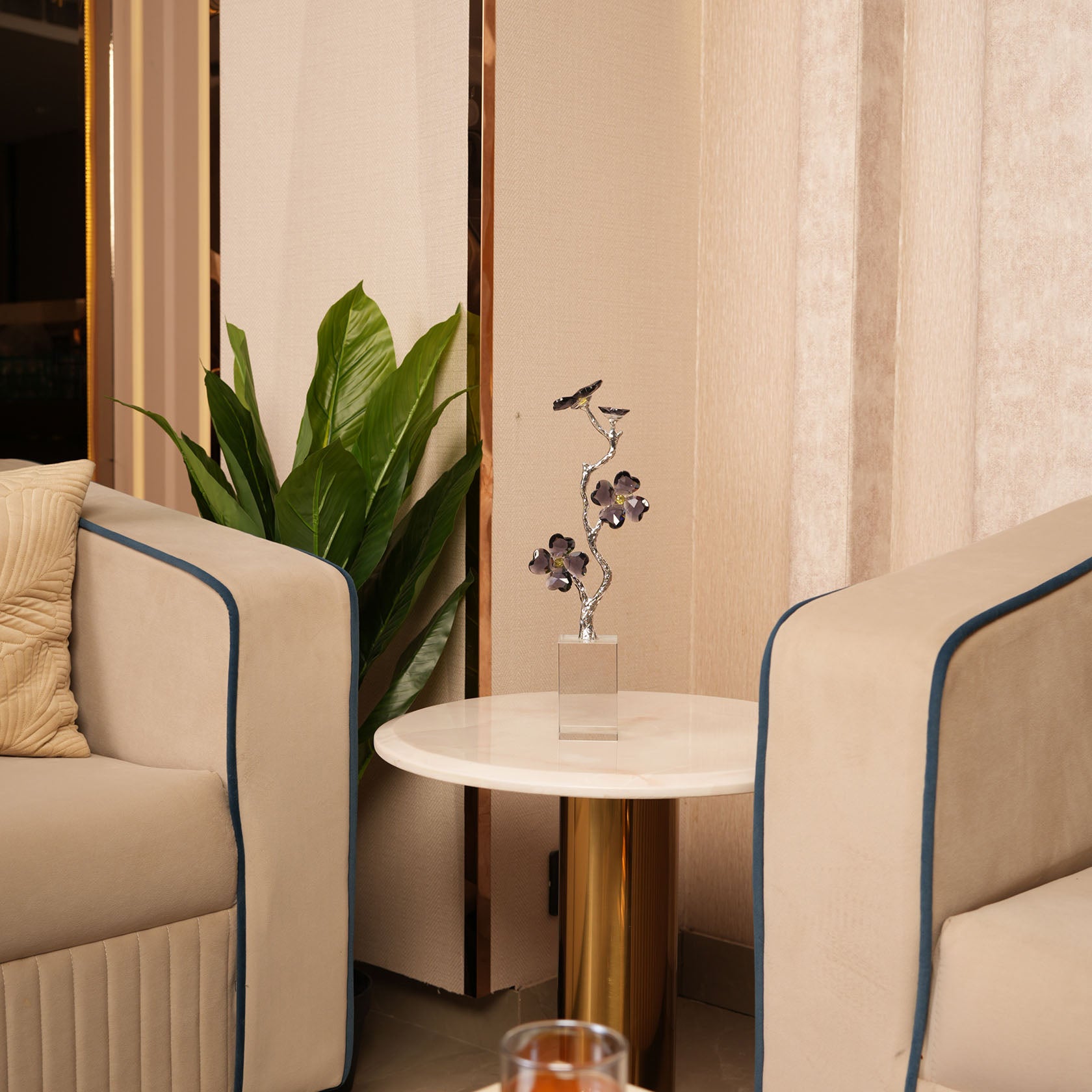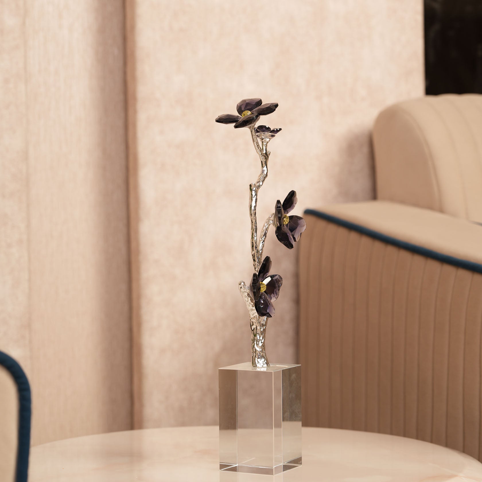 This stunning sculptural accent features amethyst-toned crystal dogwood blossoms and buds resting upon a realistic, textured silver-tone branch. The piece is elegantly supported by a substantial clear acrylic rectangular plinth. A beautiful accent for a desk or console, it brings year-round, glittering natural beauty to any luxurious space.