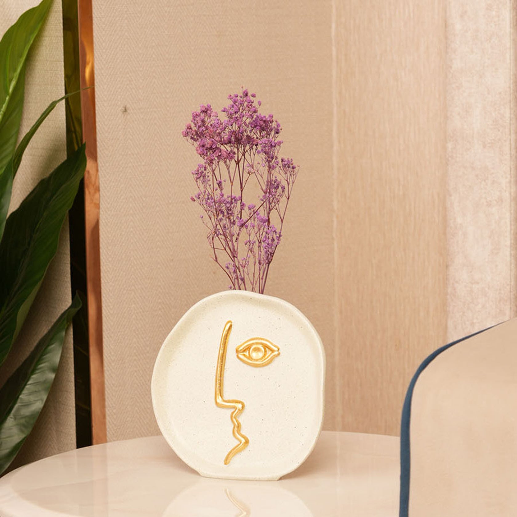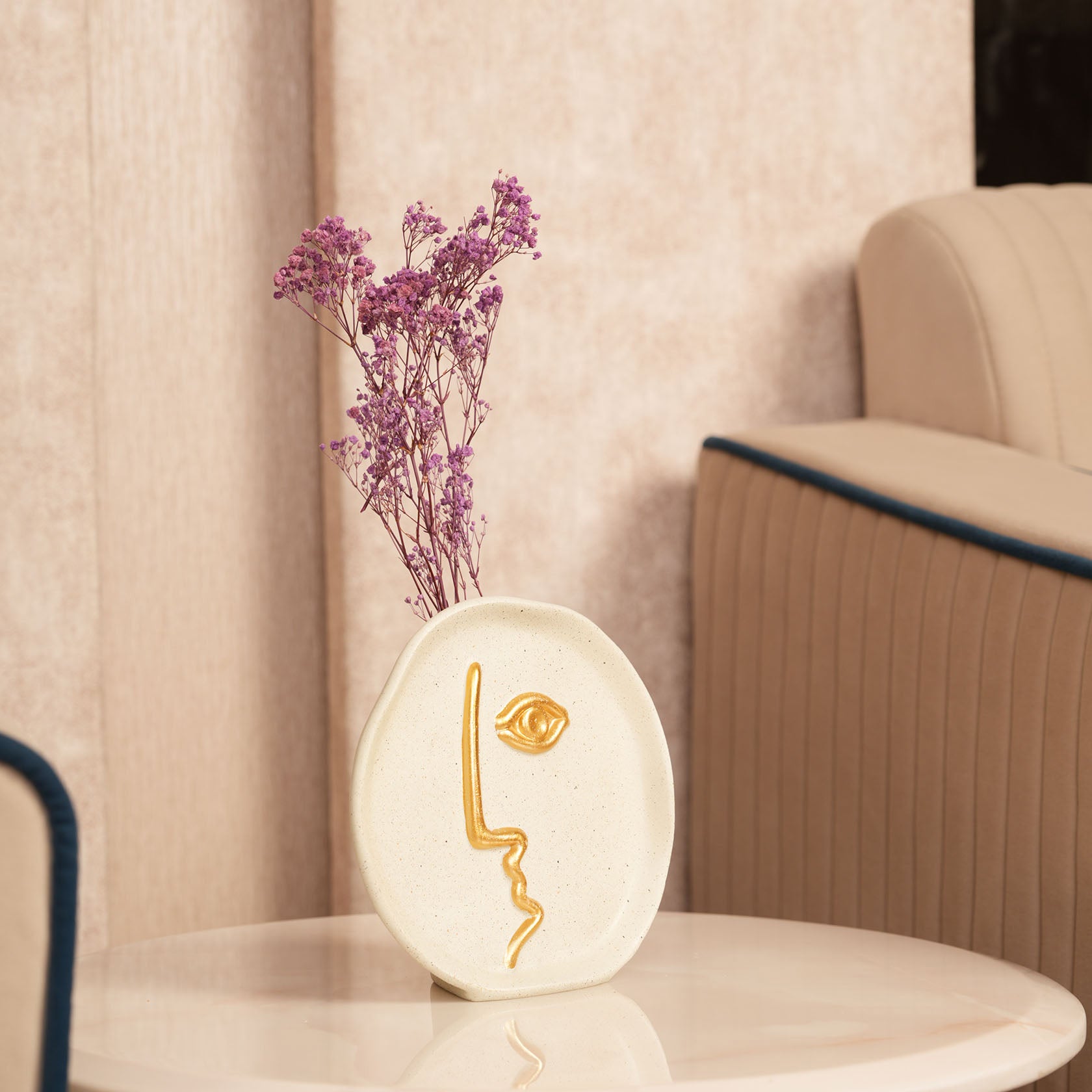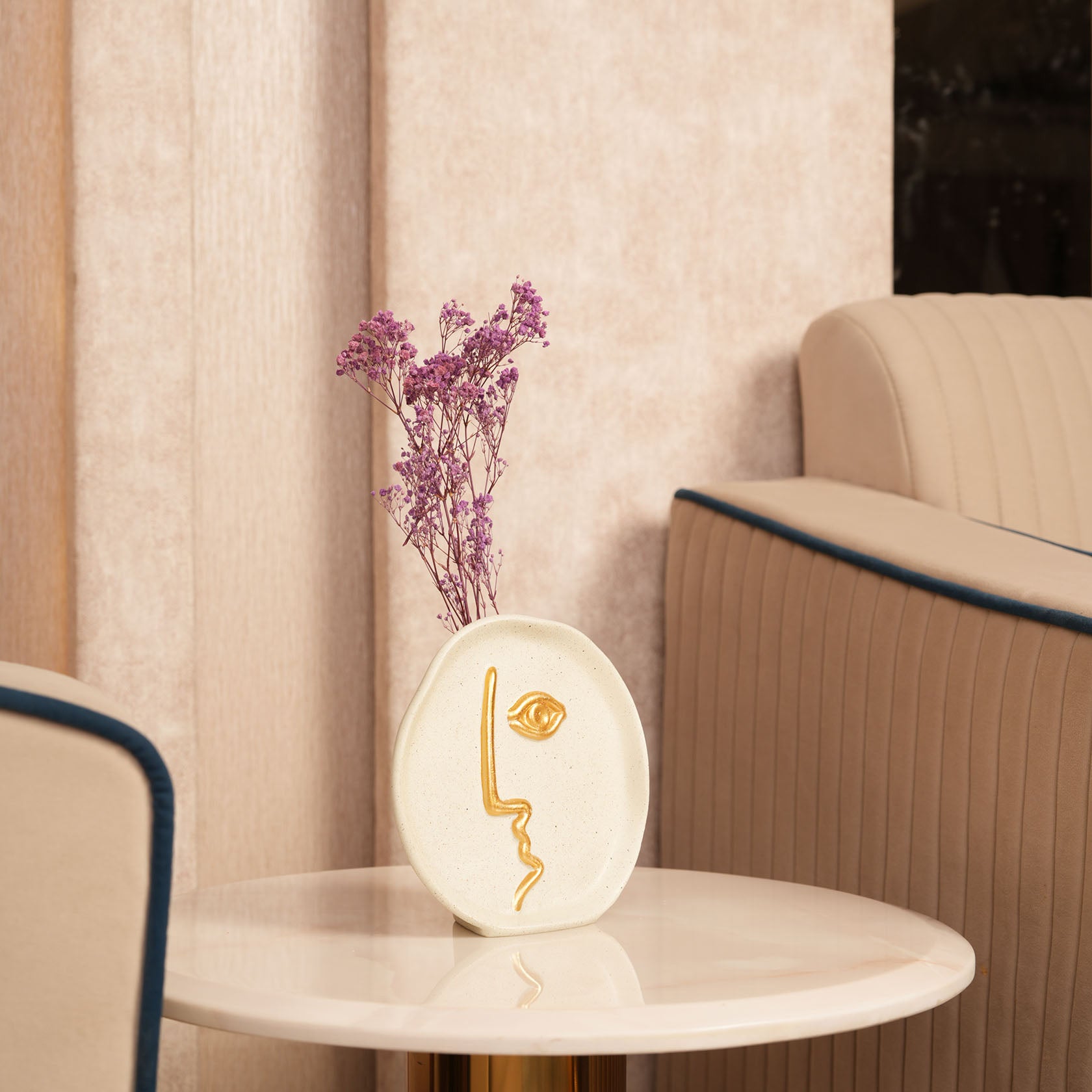 The Modern Minimalist Faceline Showpiece brings abstract elegance to your interiors. Crafted from speckled, neutral-toned ceramic, this unique sculpture features a single, flowing gold-tone line art representation of a face and eye. The piece's organic, slightly irregular shape and bold metallic detail make it a striking focal point. Display this sophisticated accent on a bookshelf, mantle, or desk to effortlessly infuse contemporary artistry into your space.