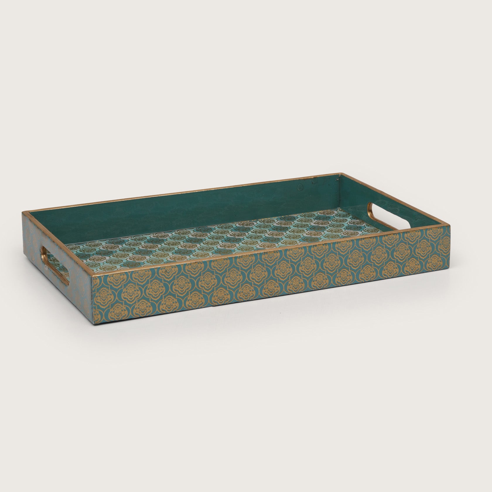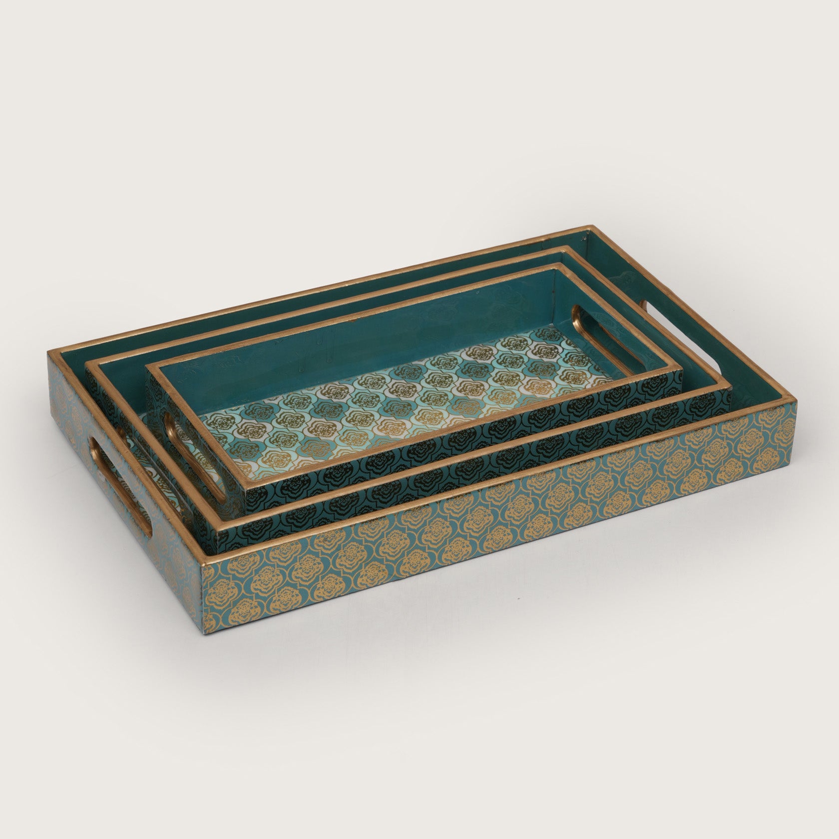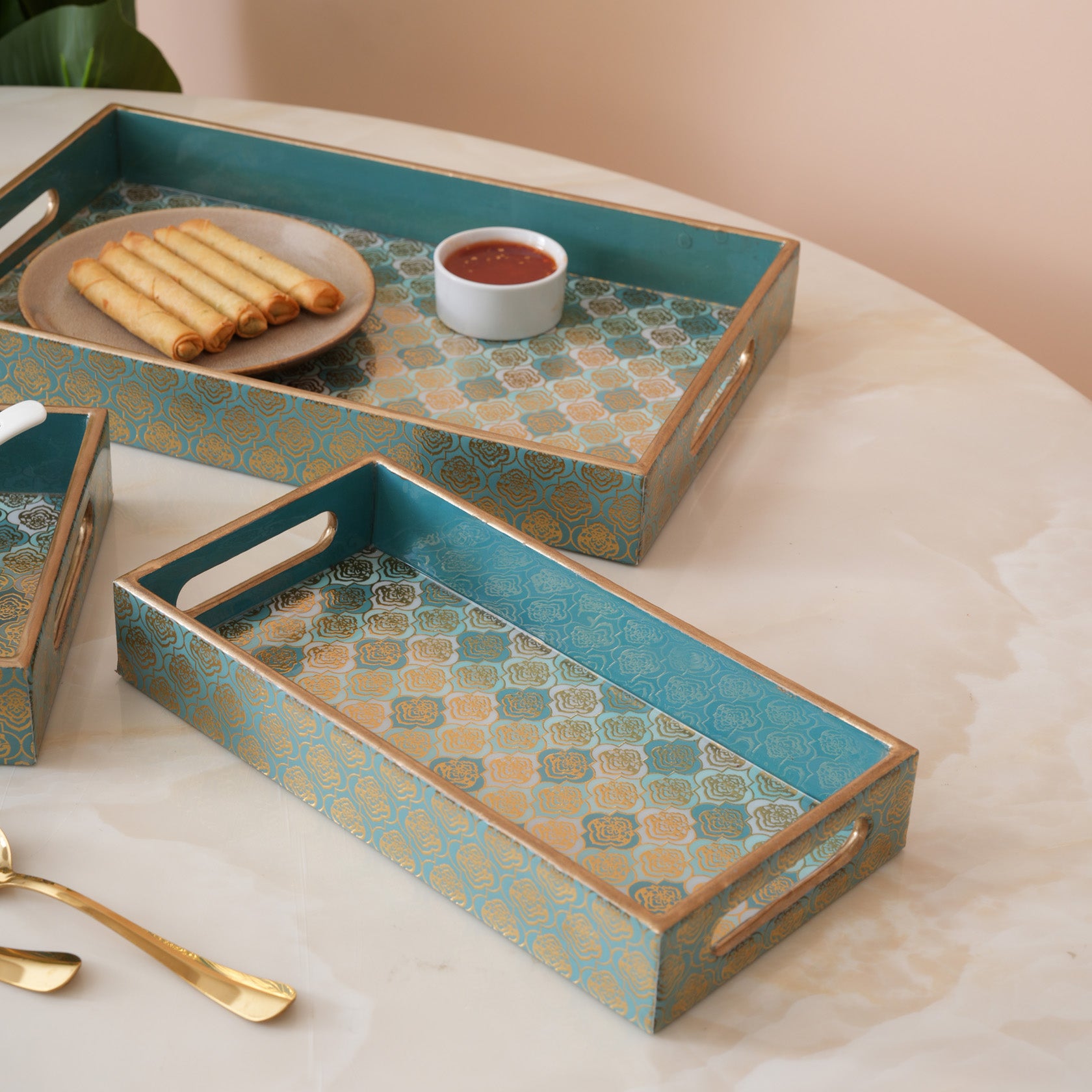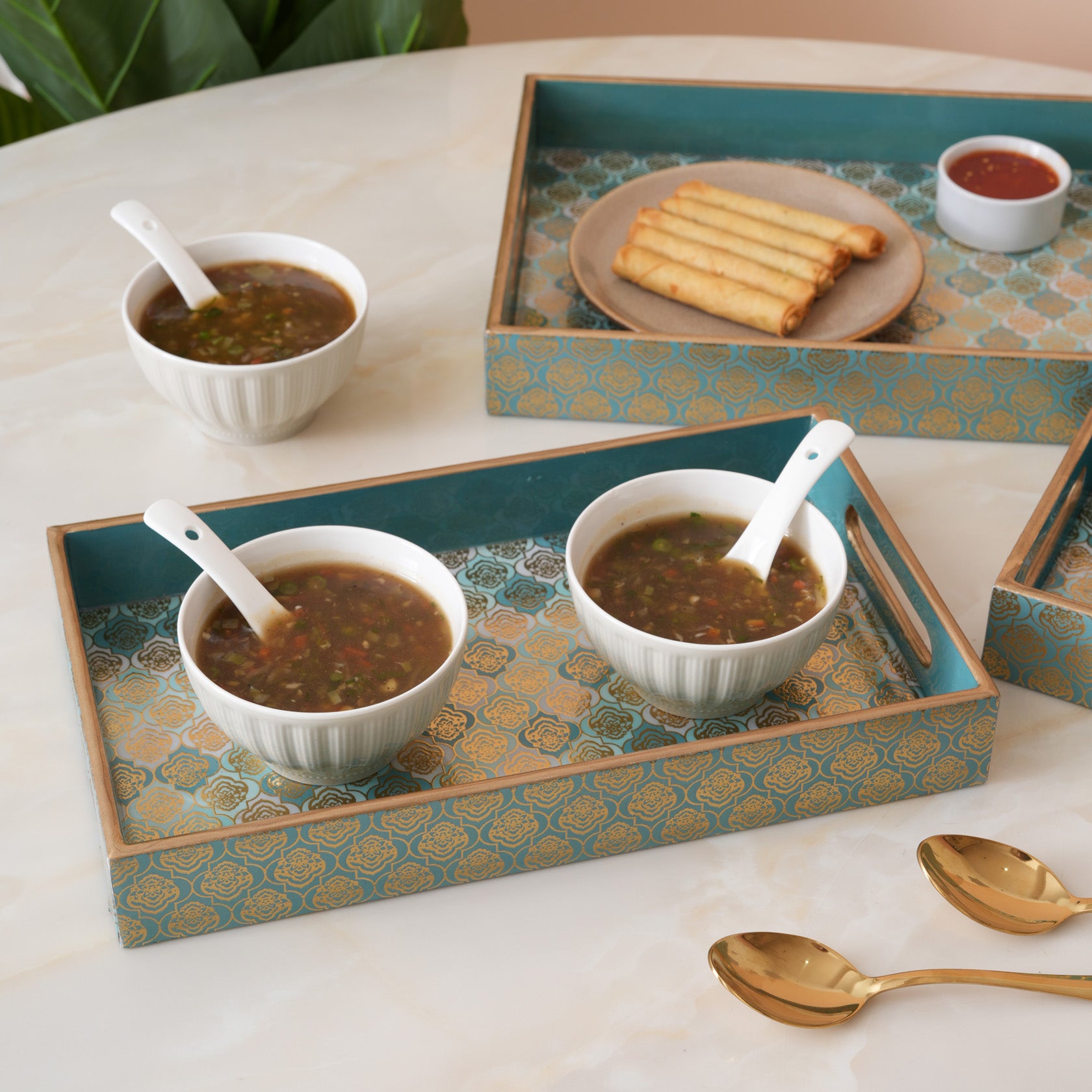 Elevate your hosting with this elegant set of three nesting trays, featuring a sophisticated teal and gold damask pattern. Each tray is meticulously crafted with a luxe metallic trim and integrated handles for seamless serving. Perfectly styled here with artisan appetizers and soups, these versatile pieces blend contemporary flair with classic charm, making them a stunning addition to any tabletop.