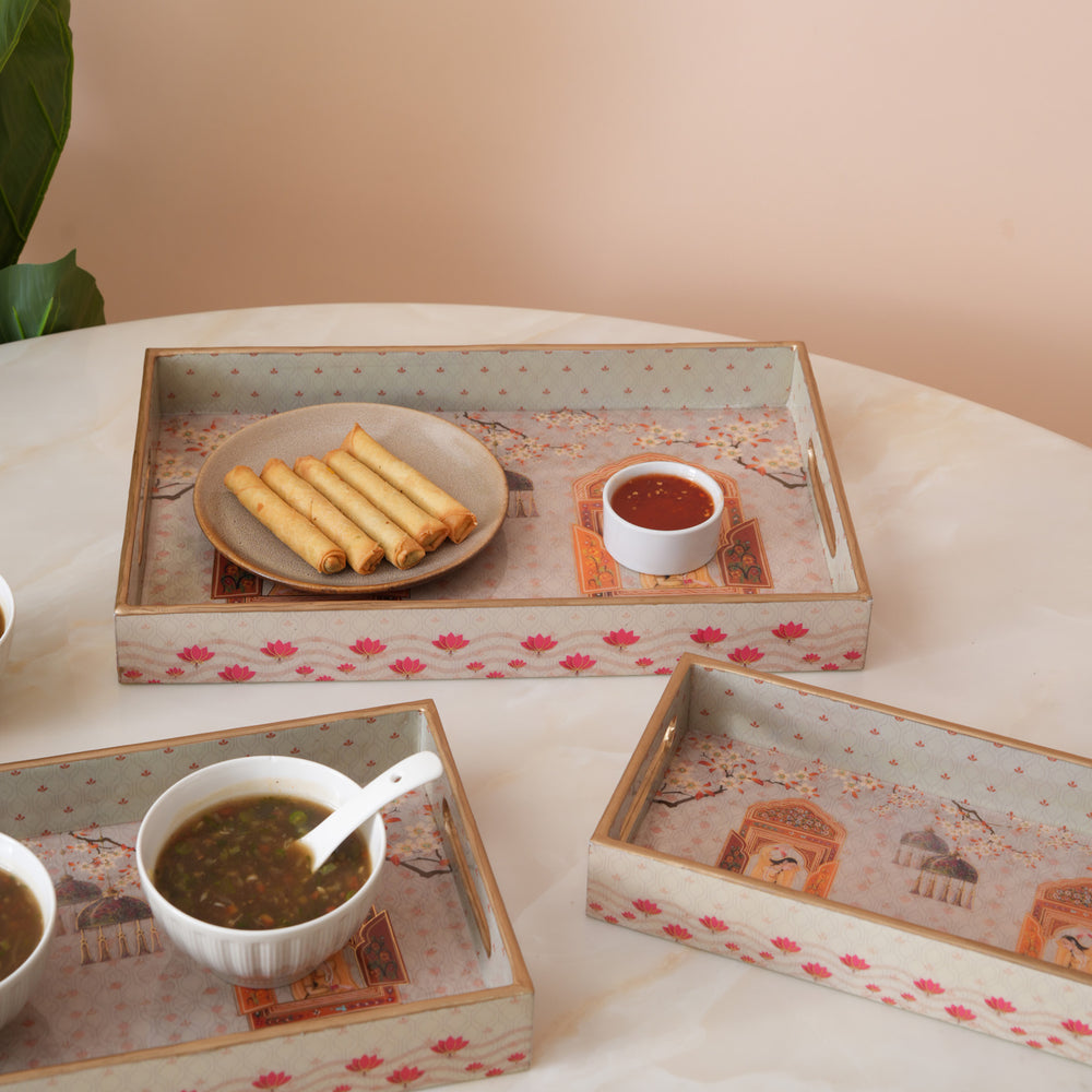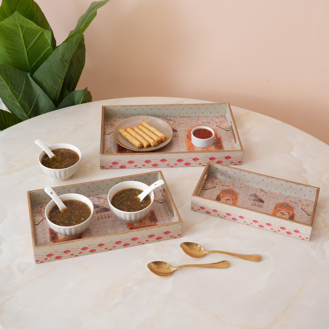 Heritage Mughal Art Decorative Nesting Serving Trays with Lotus Border - Set of 3