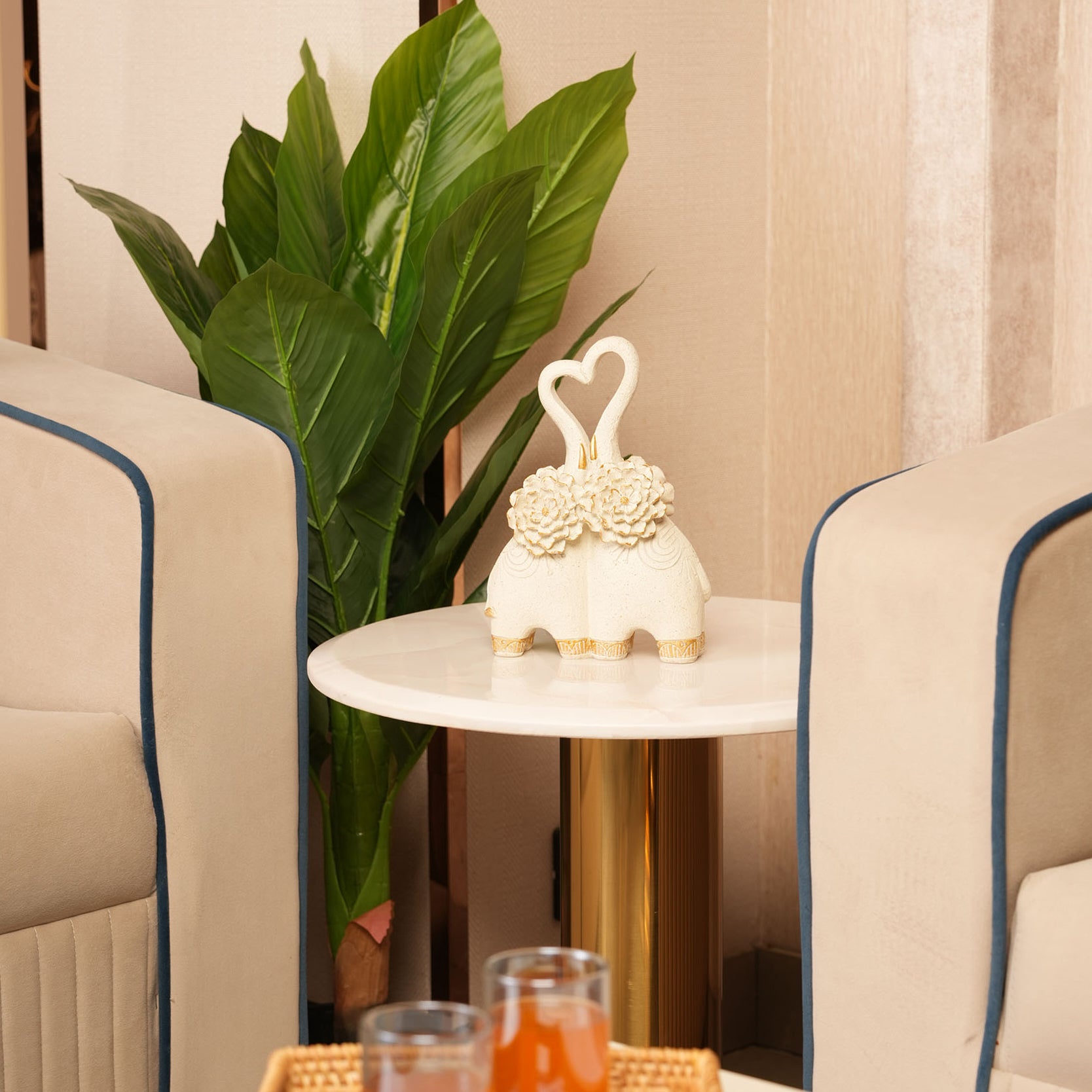 Celebrate eternal love with the Embracing Elephant Couple Heart Trunk Figurine. Crafted from speckled, neutral-toned ceramic, this touching sculpture features two elephants intertwined, their trunks forming a beautiful heart shape. The pair is embellished with intricate designs, golden accents, and two prominent gilded lotus flowers, symbolizing purity and devotion. This piece is a perfect, romantic accent for wedding décor, anniversaries, or a loved one's bookshelf.
