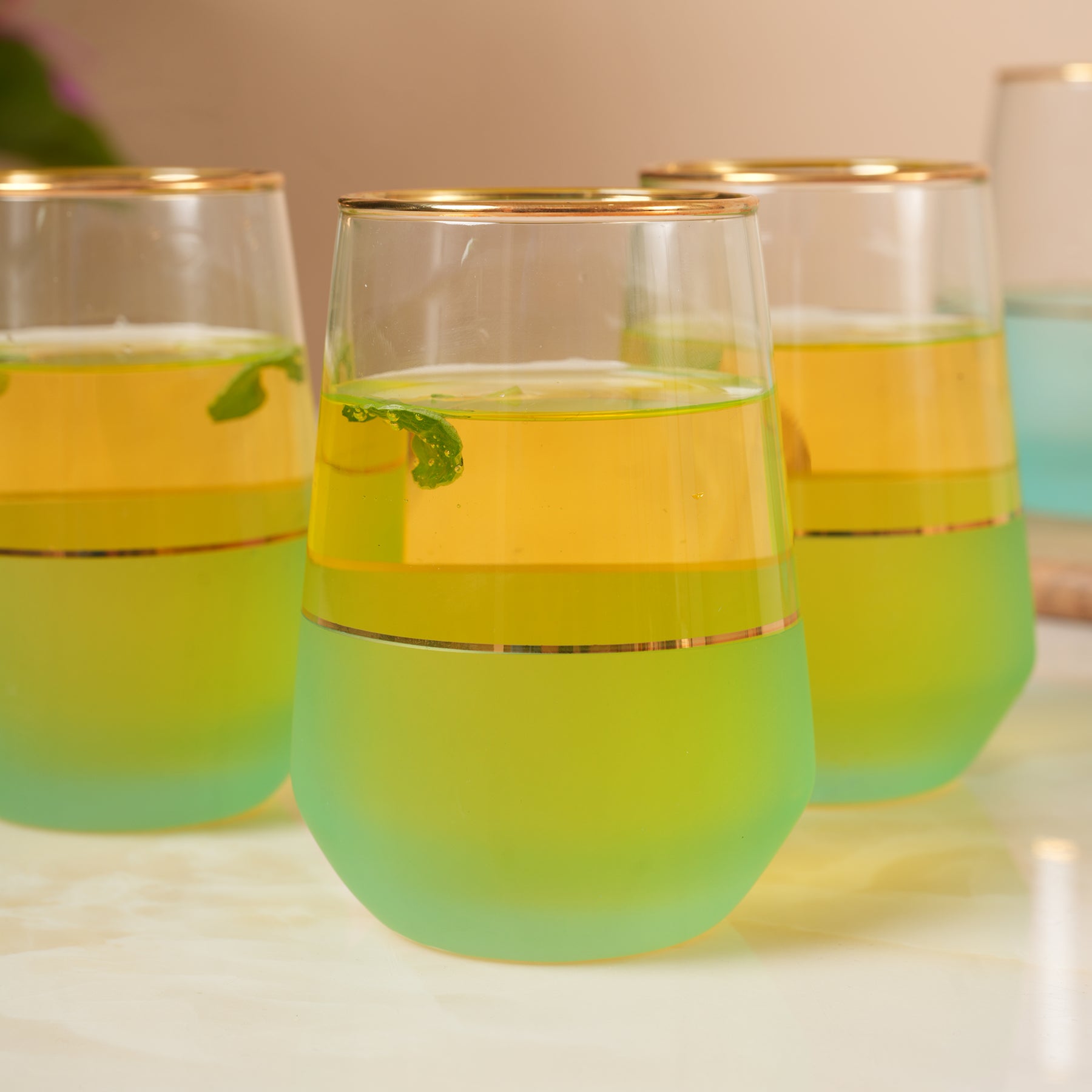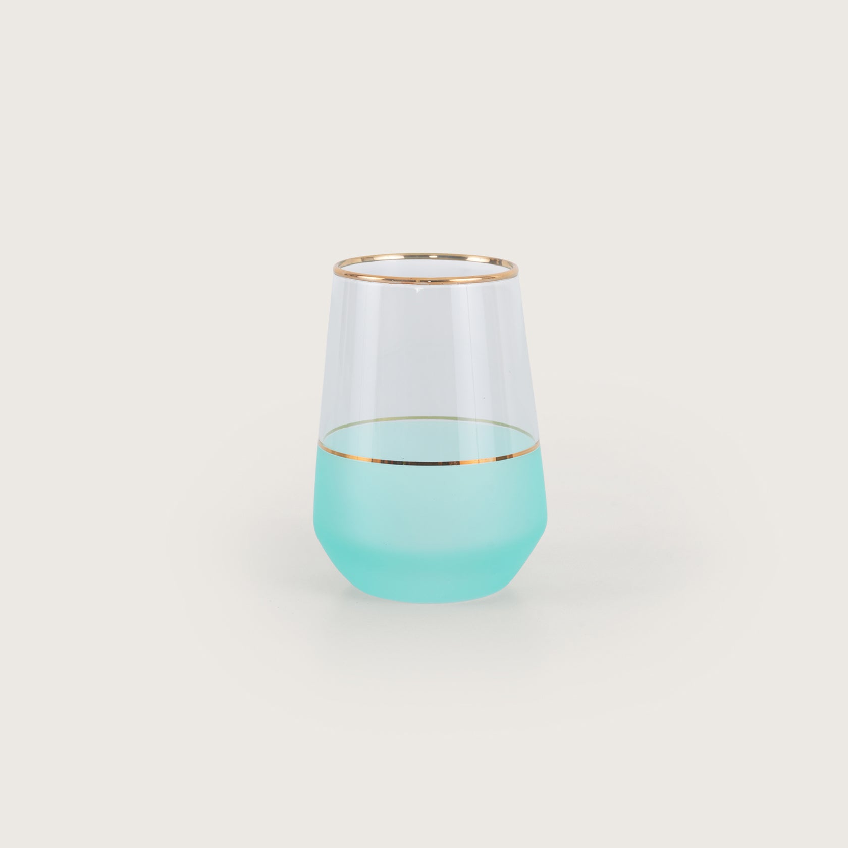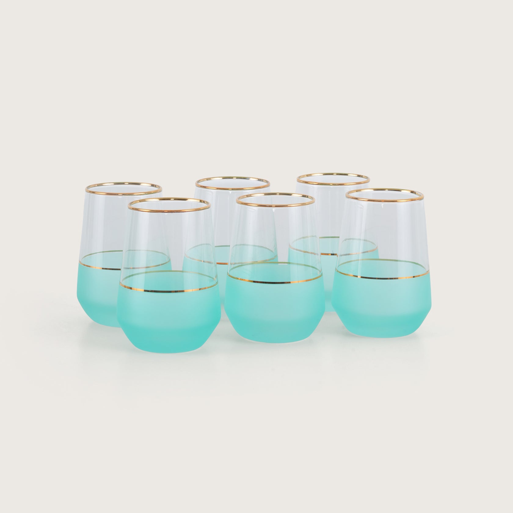 Elevate your table with this set of six stemless glasses, featuring a stunning turquoise ombre design. Each glass is accented with a delicate gold-leaf rim and a matching gold band, blending modern color with classic luxury. Perfect for wine, cocktails, or water, these vibrant, frosted-base tumblers bring a refreshing, coastal elegance to any dinner party or home bar collection.