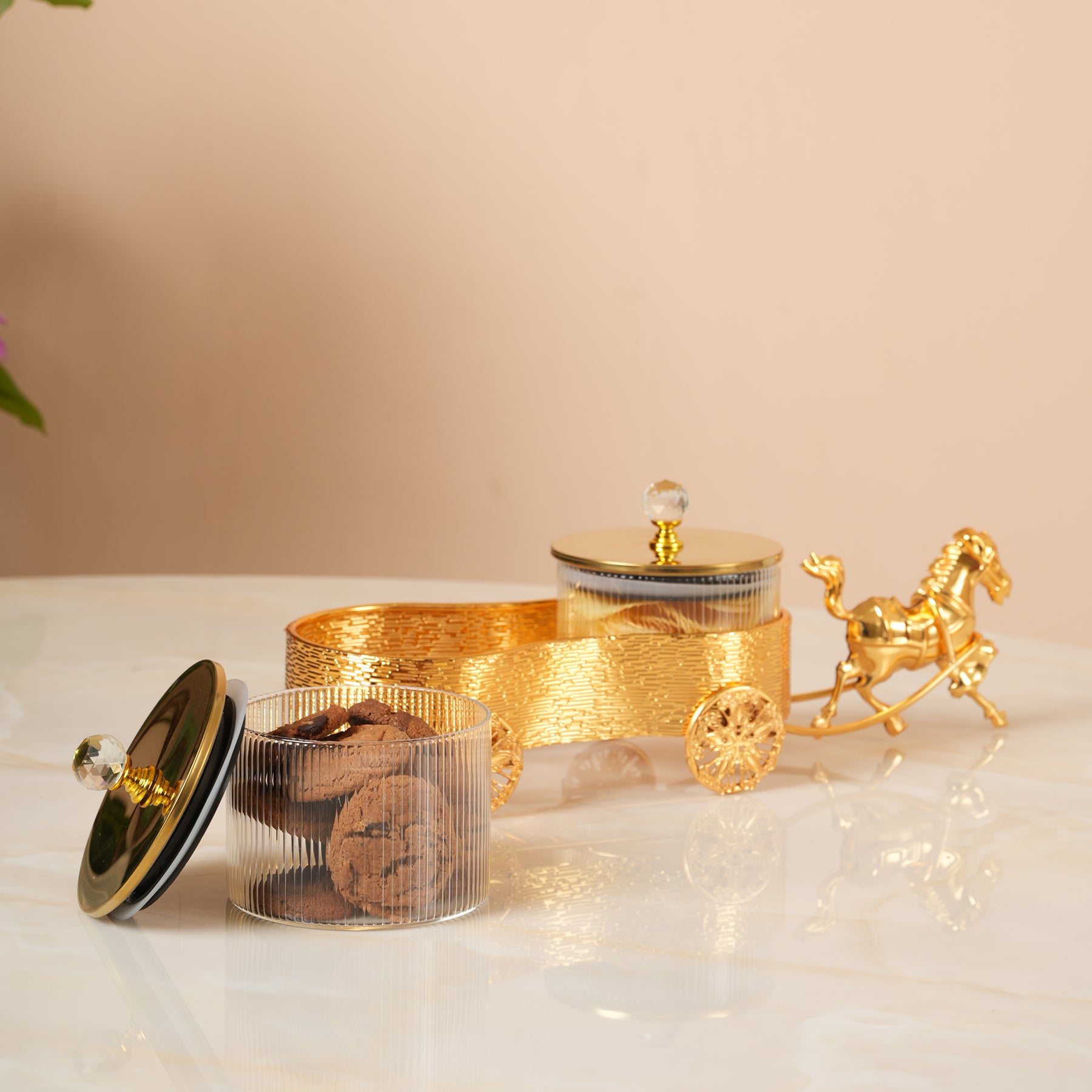 Make a grand statement with this exquisite Golden Horse and Carriage Serving Set. Designed for those who love regal decor, this set features a brilliantly polished gold-finished carriage holding two premium ribbed glass canisters. Each jar is topped with a metallic lid and a crystal-style faceted knob for a touch of sparkle. Whether used to serve fine candies, dried fruits, or exotic spices, this ornate centerpiece brings a sense of royal charm to your dining table or vanity