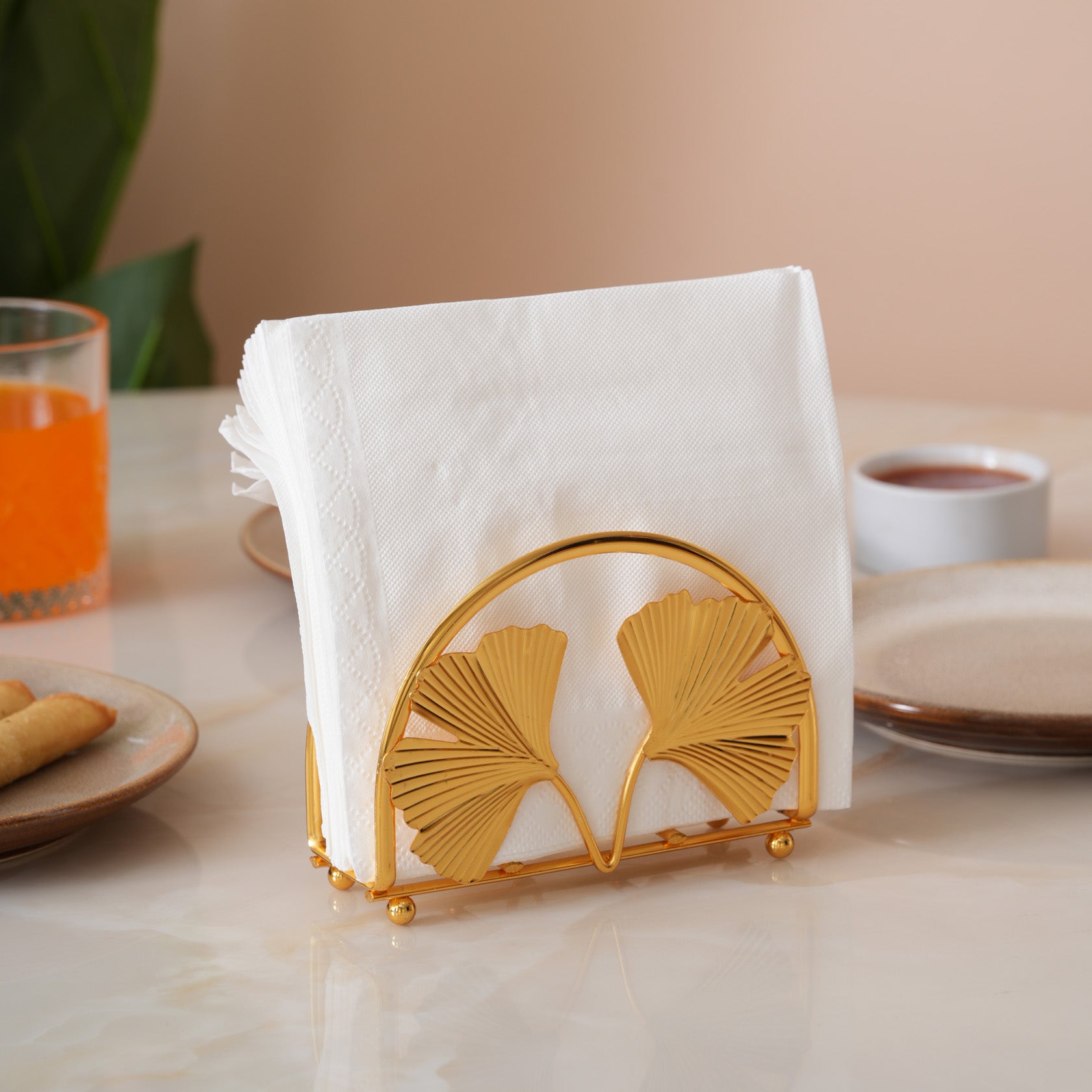 Elegant gold metal napkin holder featuring dual leaf accents, perfect for adding a touch of luxury to dining tables, kitchen counters, or coffee setups. Its sturdy design keeps napkins organized while elevating your décor with a premium, decorative charm