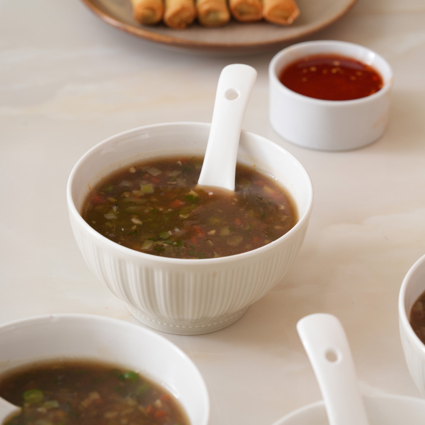 This premium set of four ivory-toned ceramic soup bowls features a refined, subtle vertical ribbing for an elevated feel. Each piece includes a matching spoon, perfect for enjoying ramen, pho, miso, or cereal. Their sturdy, ergonomic design and neutral aesthetic make them a prime addition to any modern, minimalist kitchen dinnerware collection.