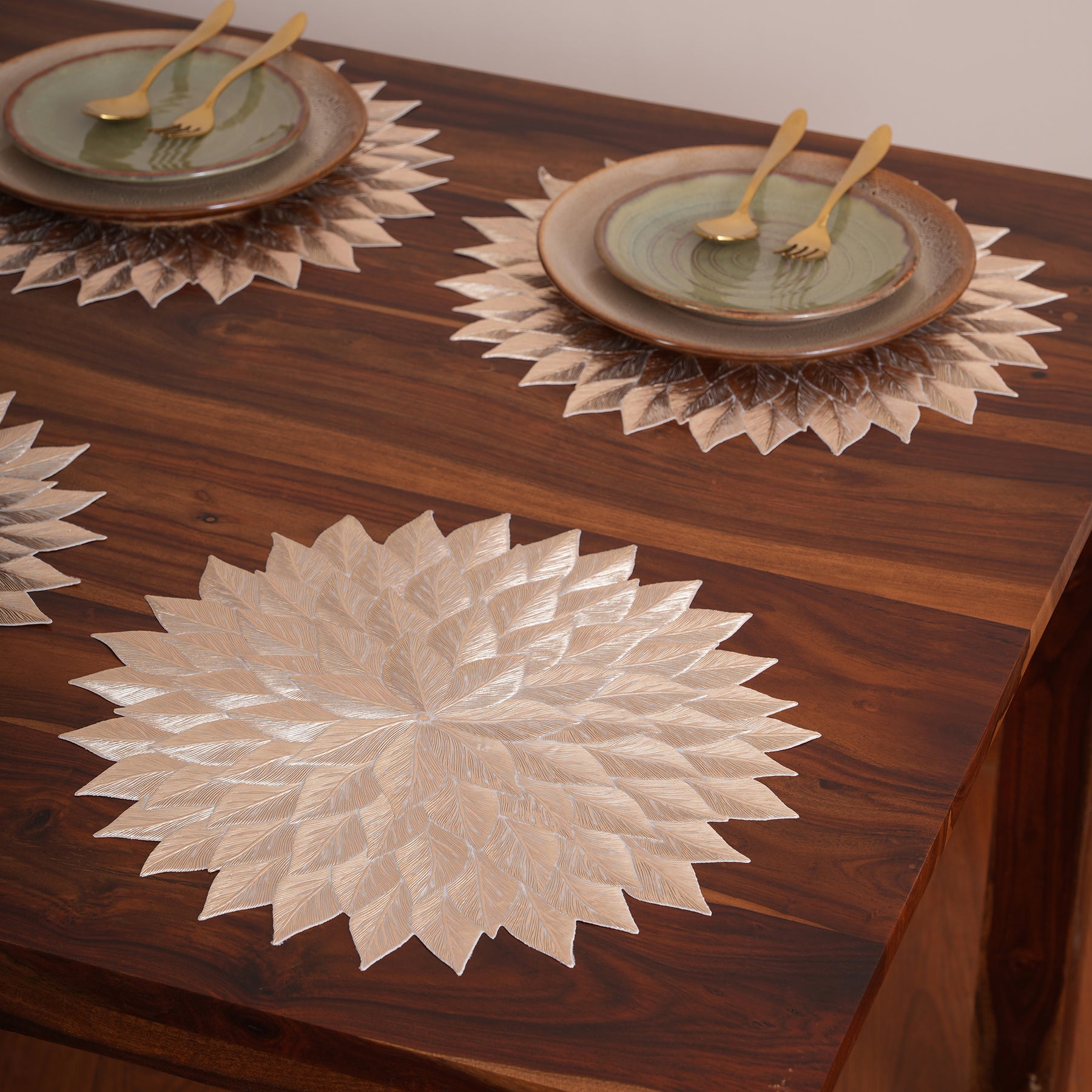 Add a luxurious shimmer to your table with this set of 6 metallic rose gold placemats, featuring a striking multi-layered pointed leaf design. Crafted from high-quality PVC, these durable mats offer exceptional heat resistance and protection for your surfaces. Their intricate, non-slip, and washable construction makes them a stunning and practical choice for elevating both modern daily dining and elegant holiday celebrations.