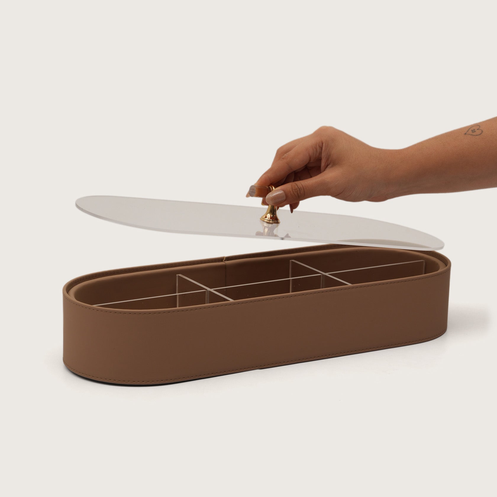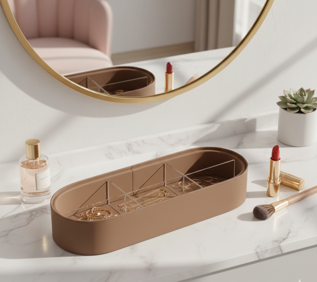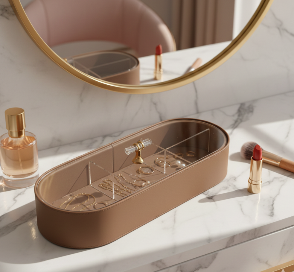 Keep your essentials beautifully organized with our Oval Multi-Compartment Organizer Box. Designed with a smooth leatherette exterior and a sleek gold-accented handle, this organizer brings modern elegance to your vanity or desk.