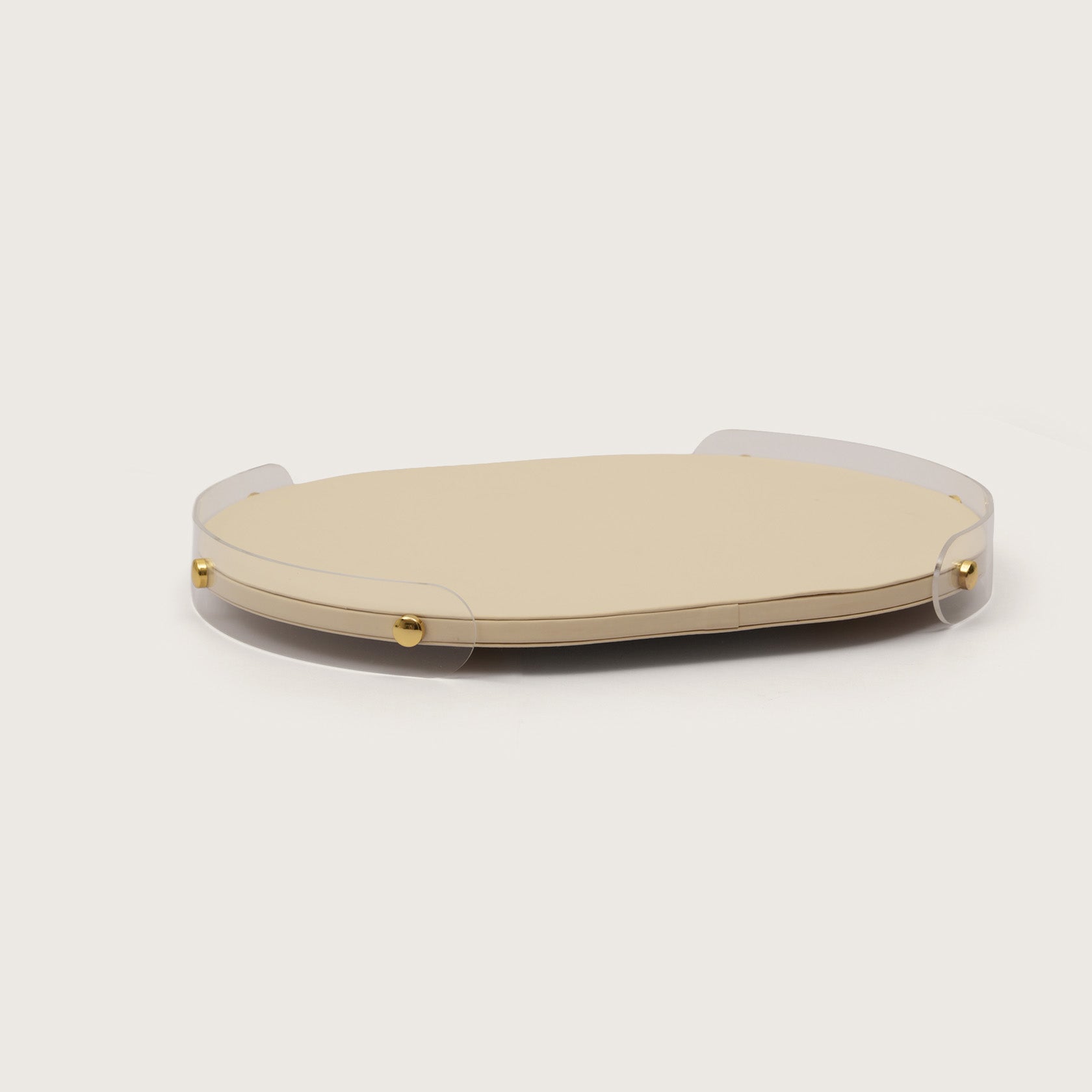 Elevate your display with this luxurious oval tray. Featuring a light, neutral beige faux leather base contrasted by clear, protective acrylic sides, it offers a modern, floating effect. The design is finished with four polished brass studs for a touch of refined glamour. Perfect for organizing jewelry or serving as a chic centerpiece on any surface.