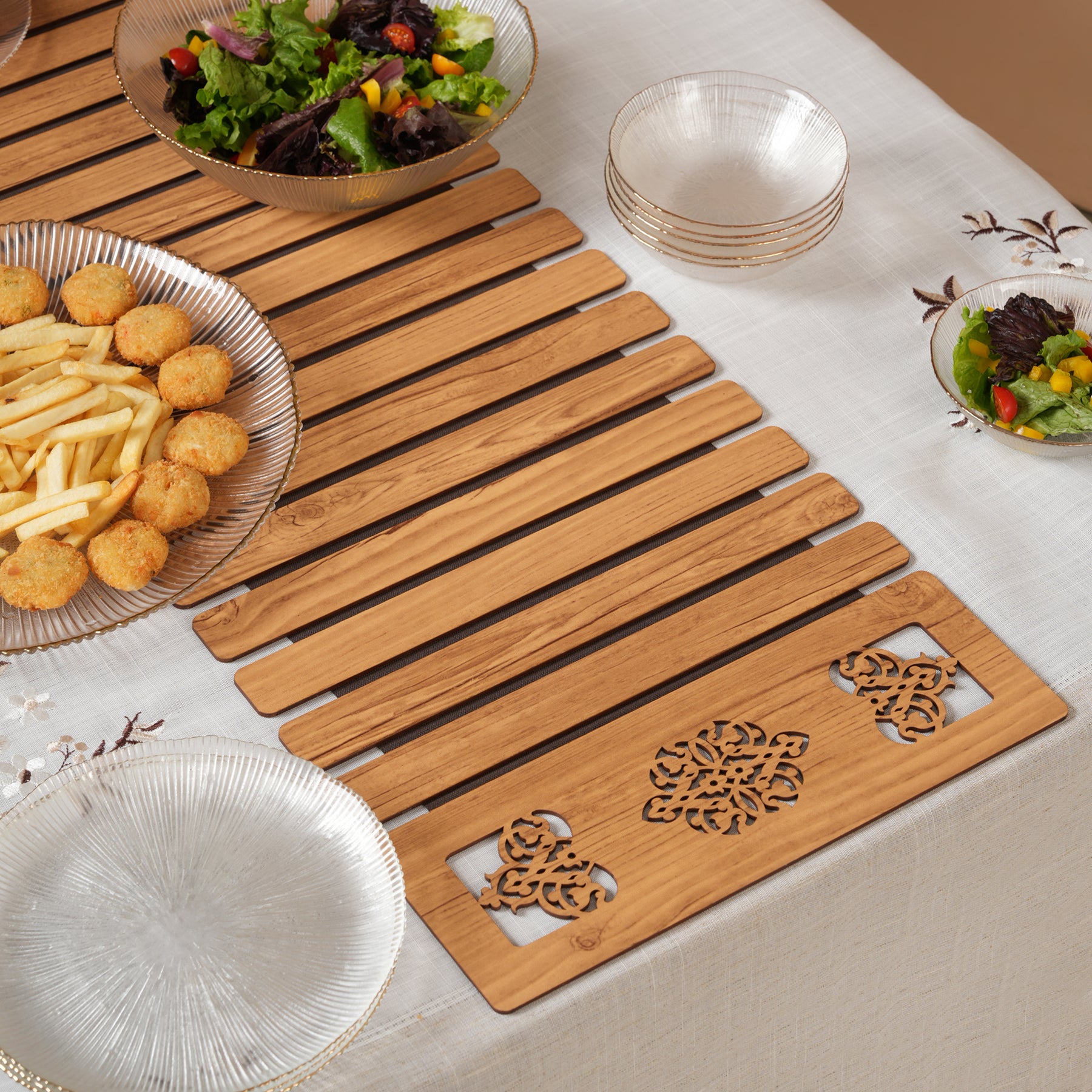 Infuse your dining space with a blend of modern architectural texture and intricate craftsmanship with this 14x72 inch table runner. Featuring a stunning linear slatted design in a deep espresso finish, this piece is elevated by beautiful laser-cut medallion panels on each end. Its bold silhouette and ornate decorative cut-outs create a unique, high-end focal point that anchors your table with sophisticated, contemporary charm.