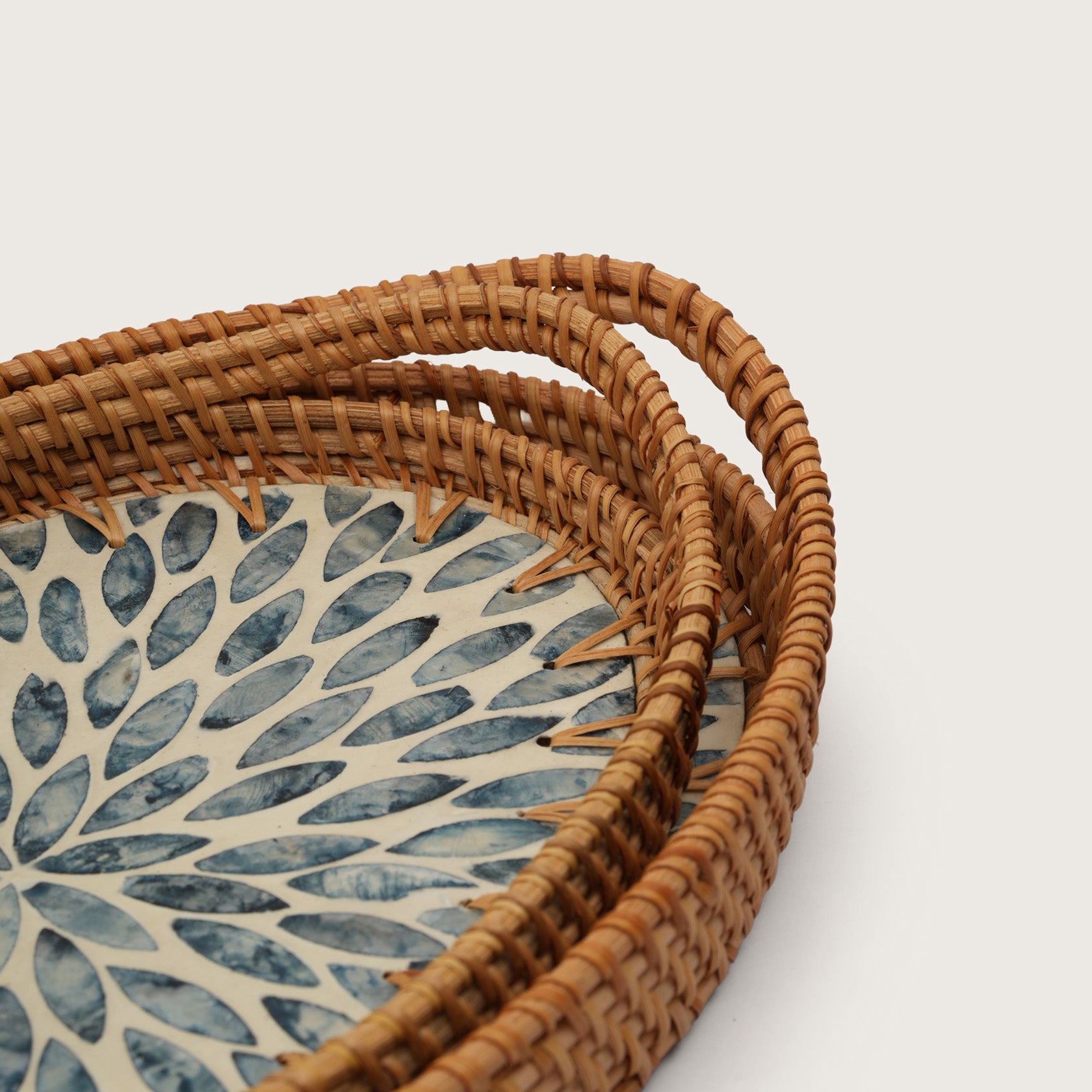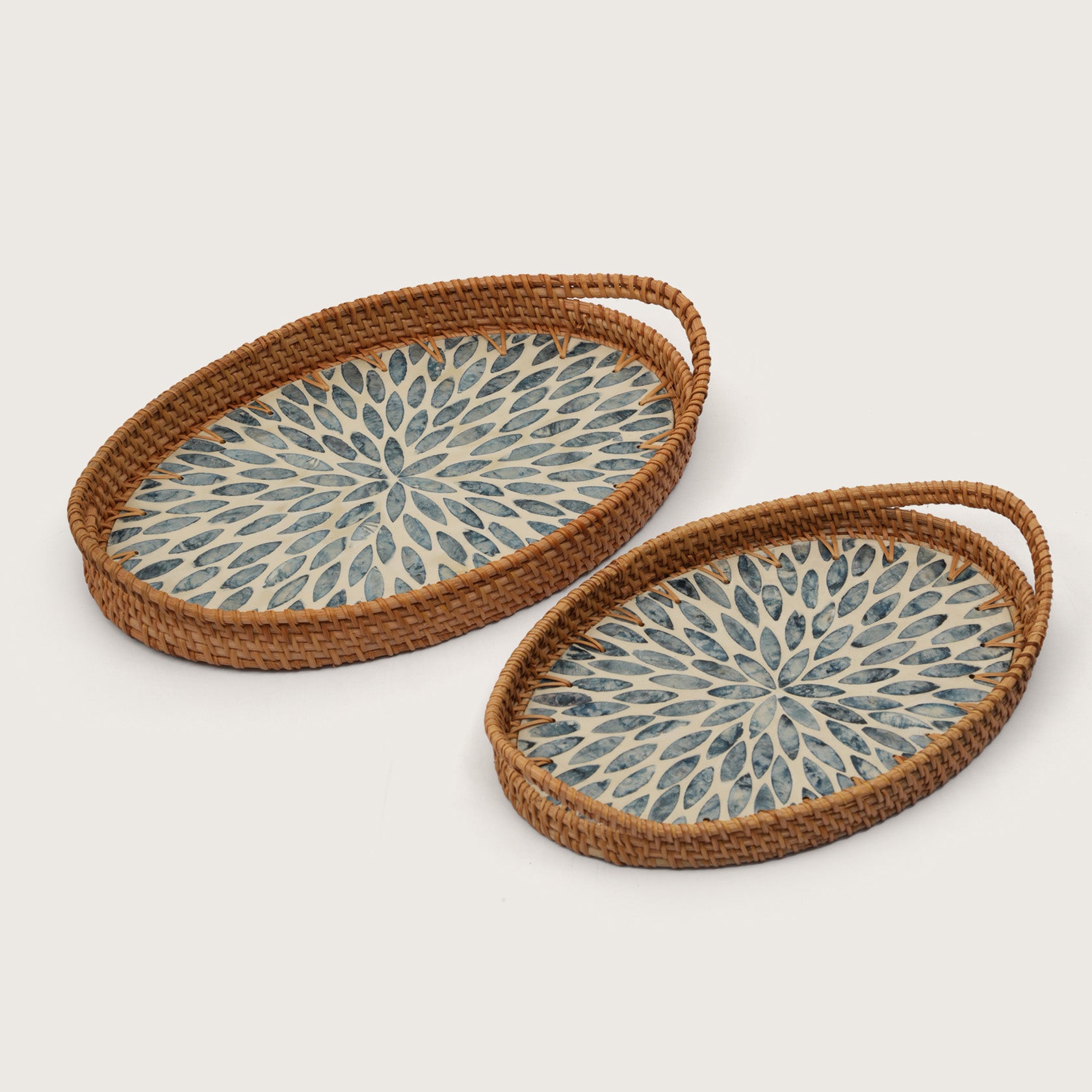 This charming oval serving tray features a sturdy, handcrafted natural rattan weave and integrated handles for easy carrying. The base is beautifully accented with a blue and white petal-patterned inlay, lending a soft, coastal, or bohemian flair. Perfect for serving drinks or displaying décor on a coffee table or ottoman.