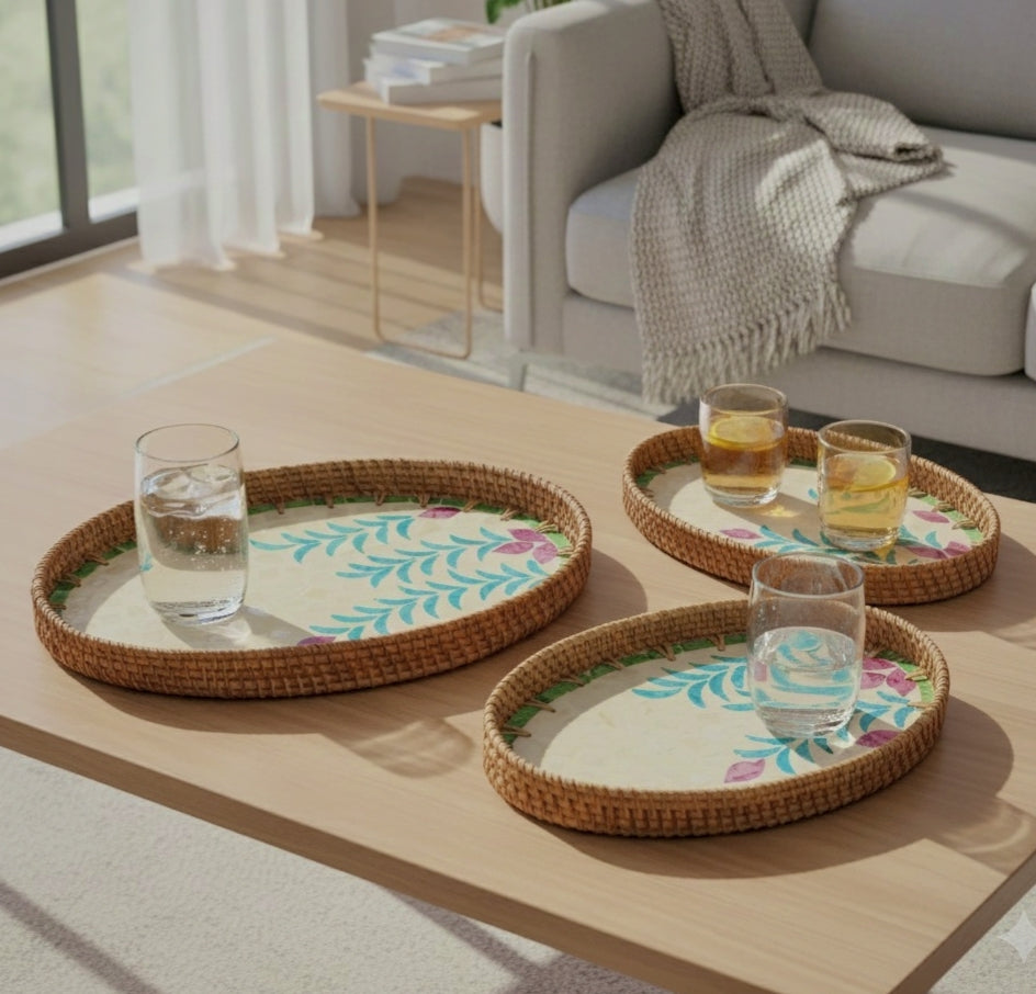 This delightful oval woven tray features an appealing natural border and a vibrant patterned base. The inlay showcases a pink and turquoise leaf mosaic, lending a fresh, tropical, and eye-catching aesthetic. Ideal for serving beverages or adding a colorful, bohemian accent to your living room décor or dining table.