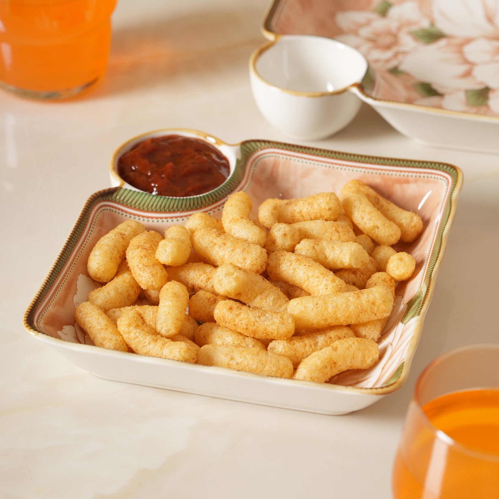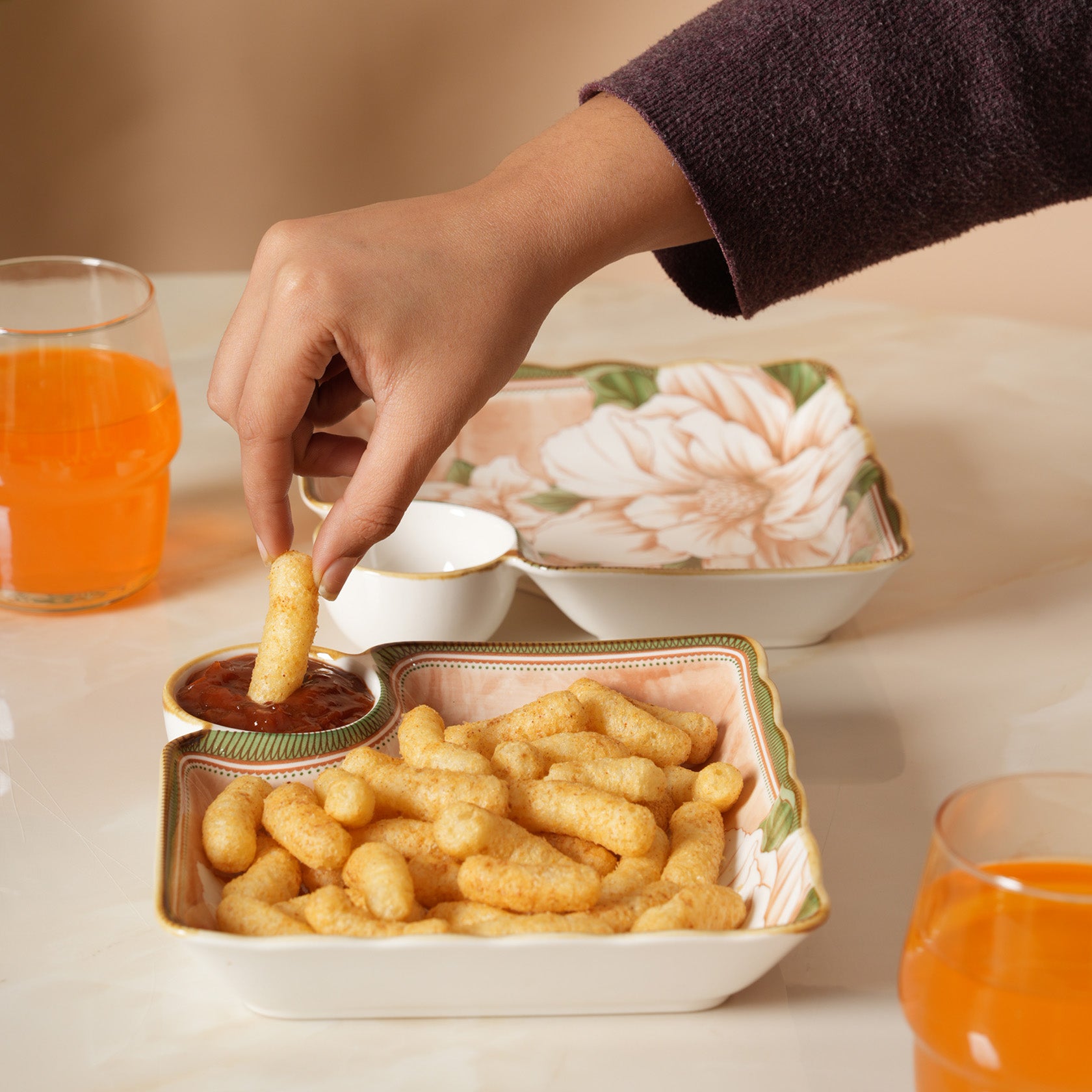 This elegant two-section serving dish is a perfect blend of functionality and refined beauty. The large rectangular section features a gorgeous soft peach and cream floral print with delicate green accents, framed by a subtly scalloped, gold-trimmed edge. The adjoining deep circular bowl is ideal for holding dips, sauces, or condiments, keeping them separate from your main appetizers or snacks. Perfect for entertaining, this platter adds a touch of vintage charm and sophistication to your dining experience.
