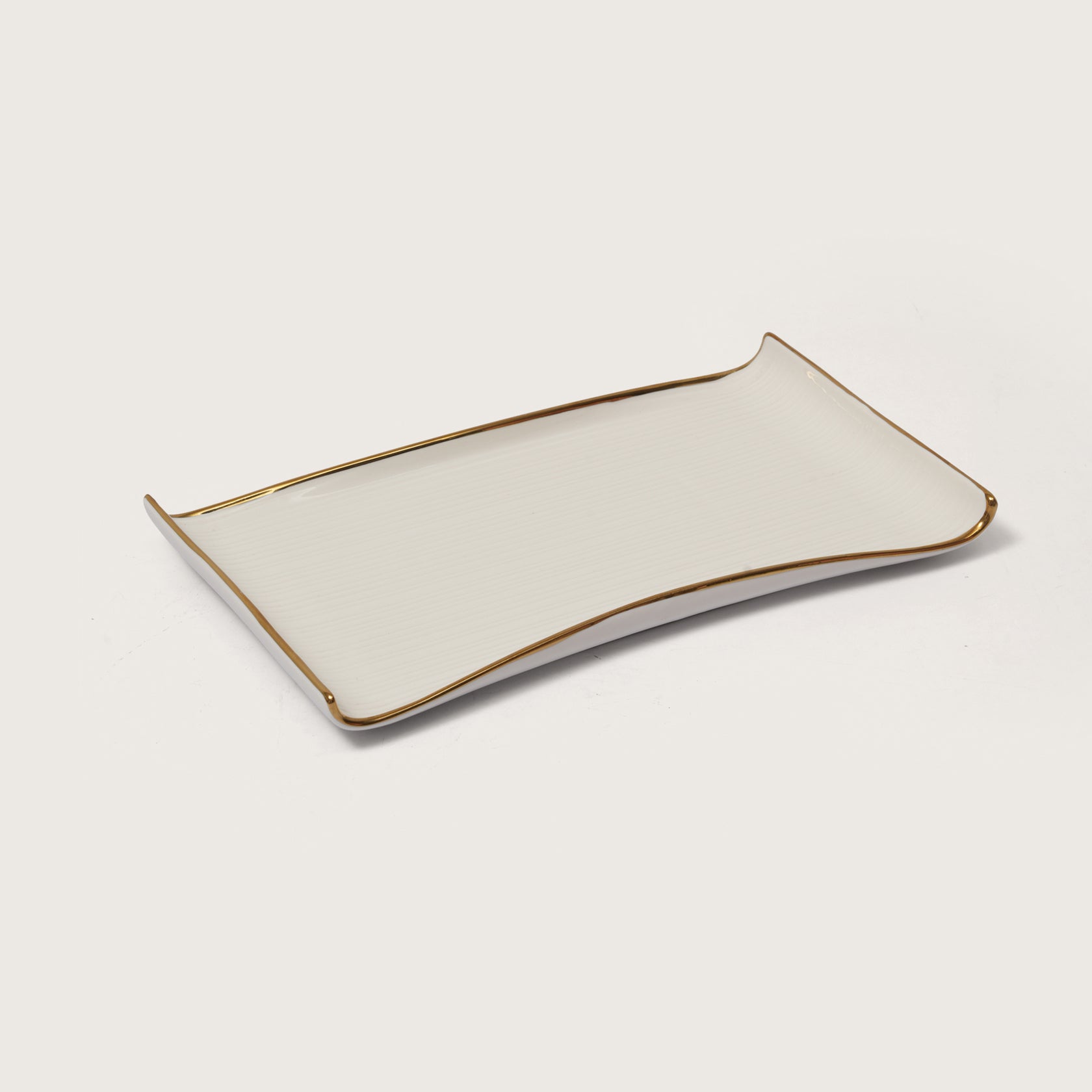 The Rectangle Line Gold Rim Tray blends modern design with luxury. Its slender rectangular shape and gently curved, upturned sides create a distinctive silhouette. The tray's creamy white interior features a subtle textured line pattern, exquisitely highlighted by the gleaming gold rim. Perfect for serving canapés, displaying décor, or organizing small essentials, it adds sophisticated elegance to any surface.