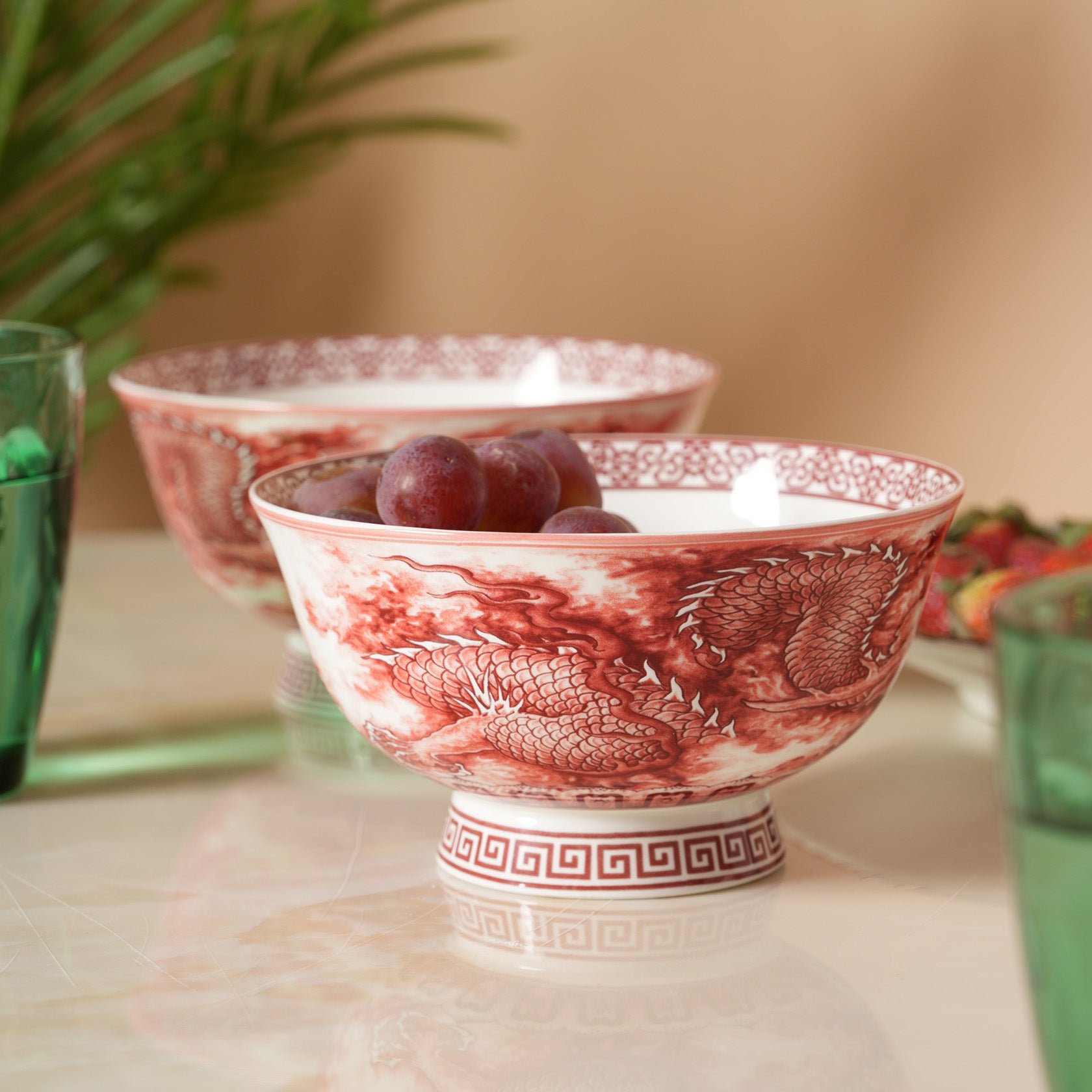 Elegant ceramic soup/ramen bowls featuring a rich red dragon pattern, perfect for serving noodles, soups, or snacks. Their traditional artwork and sturdy build add a touch of heritage charm to any dining setup. Comes as a premium set of two.