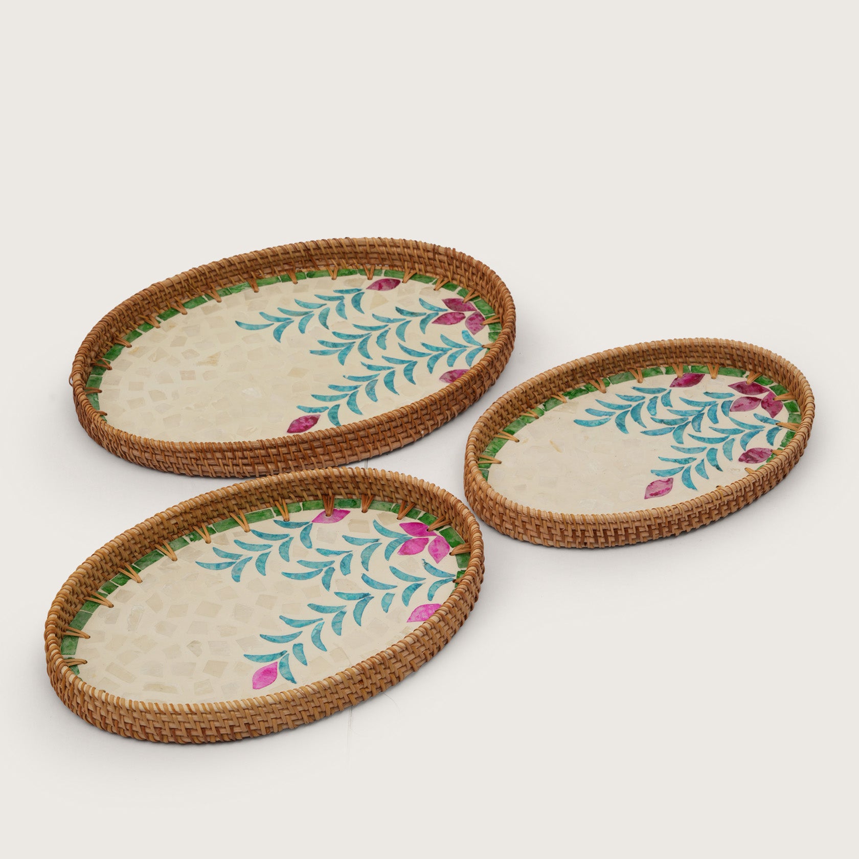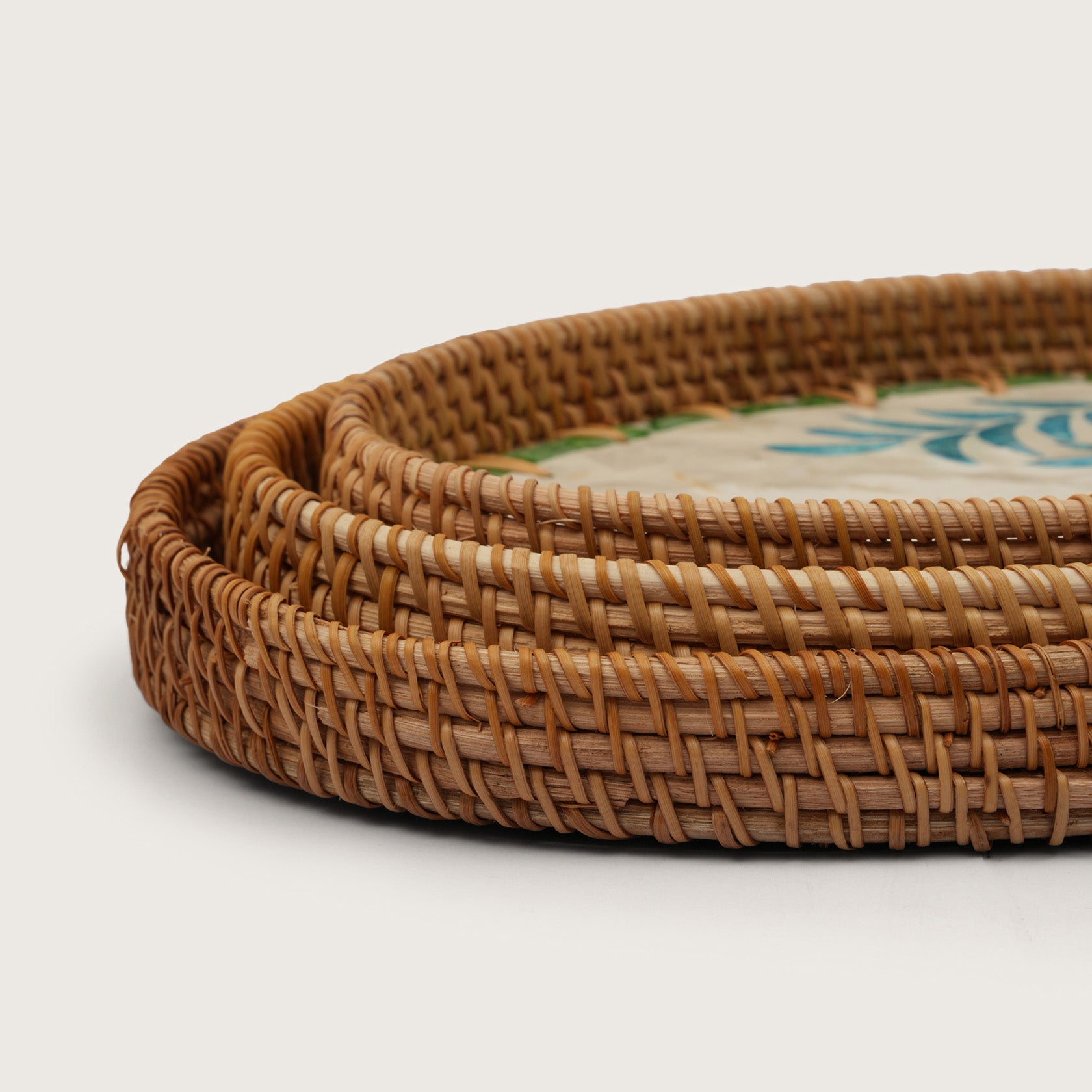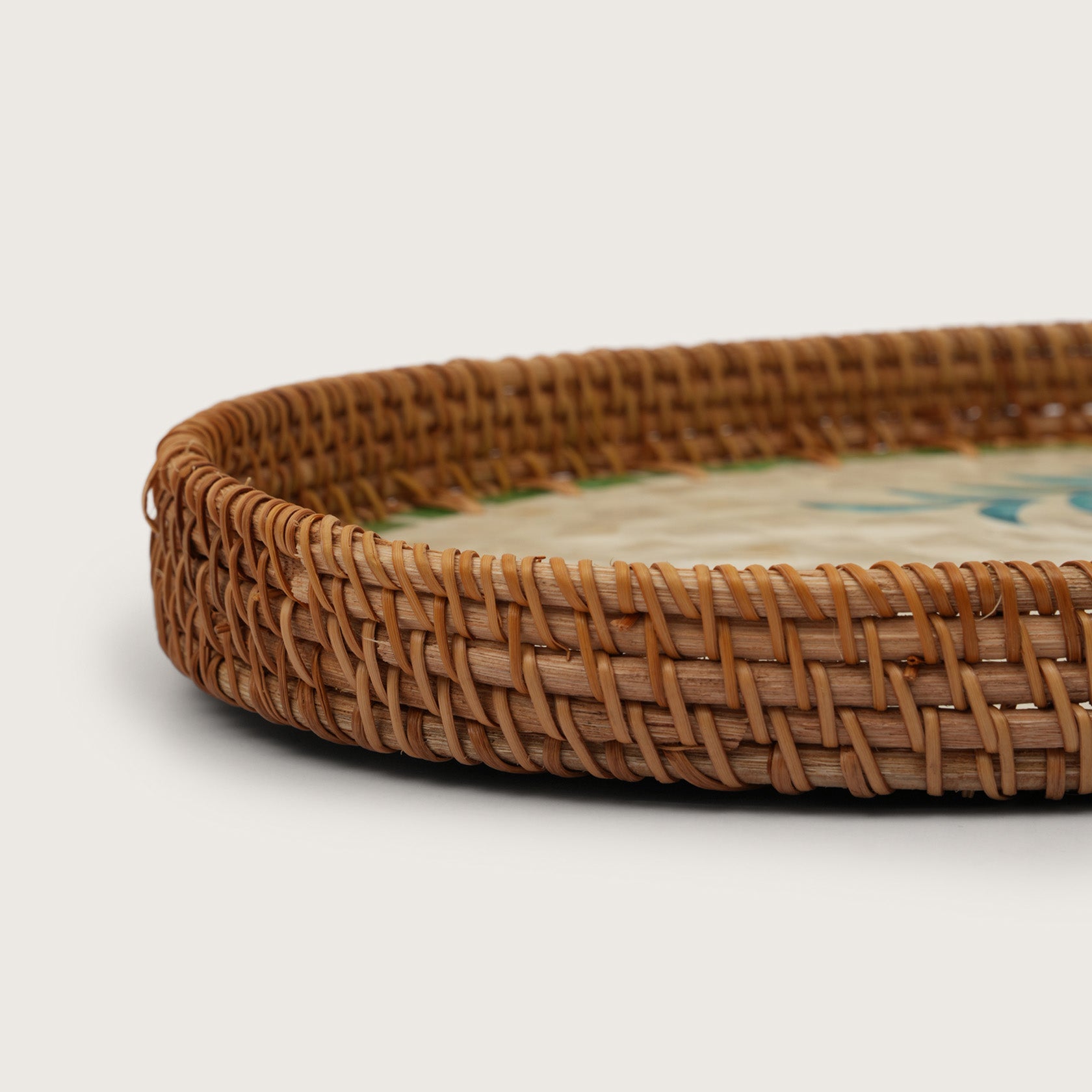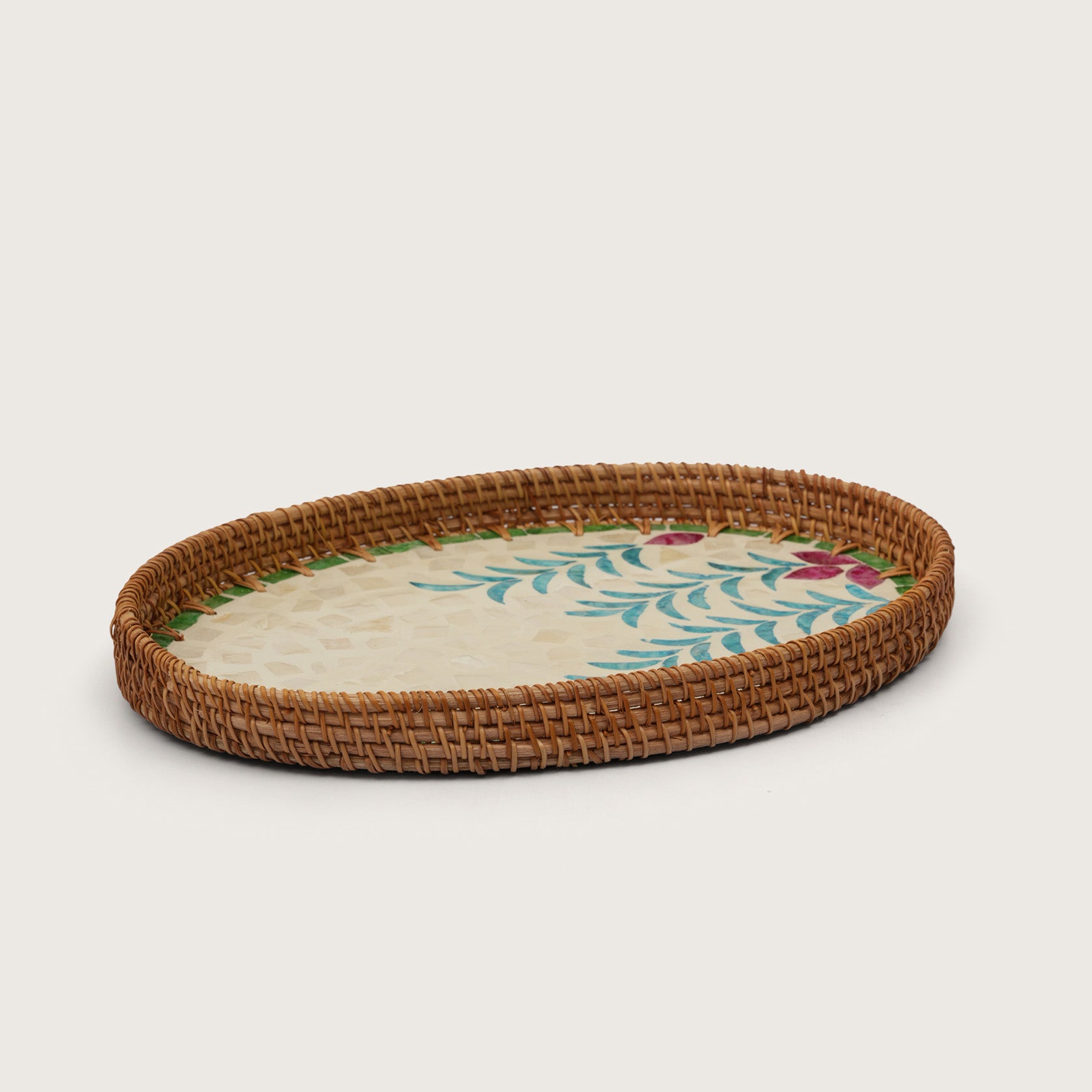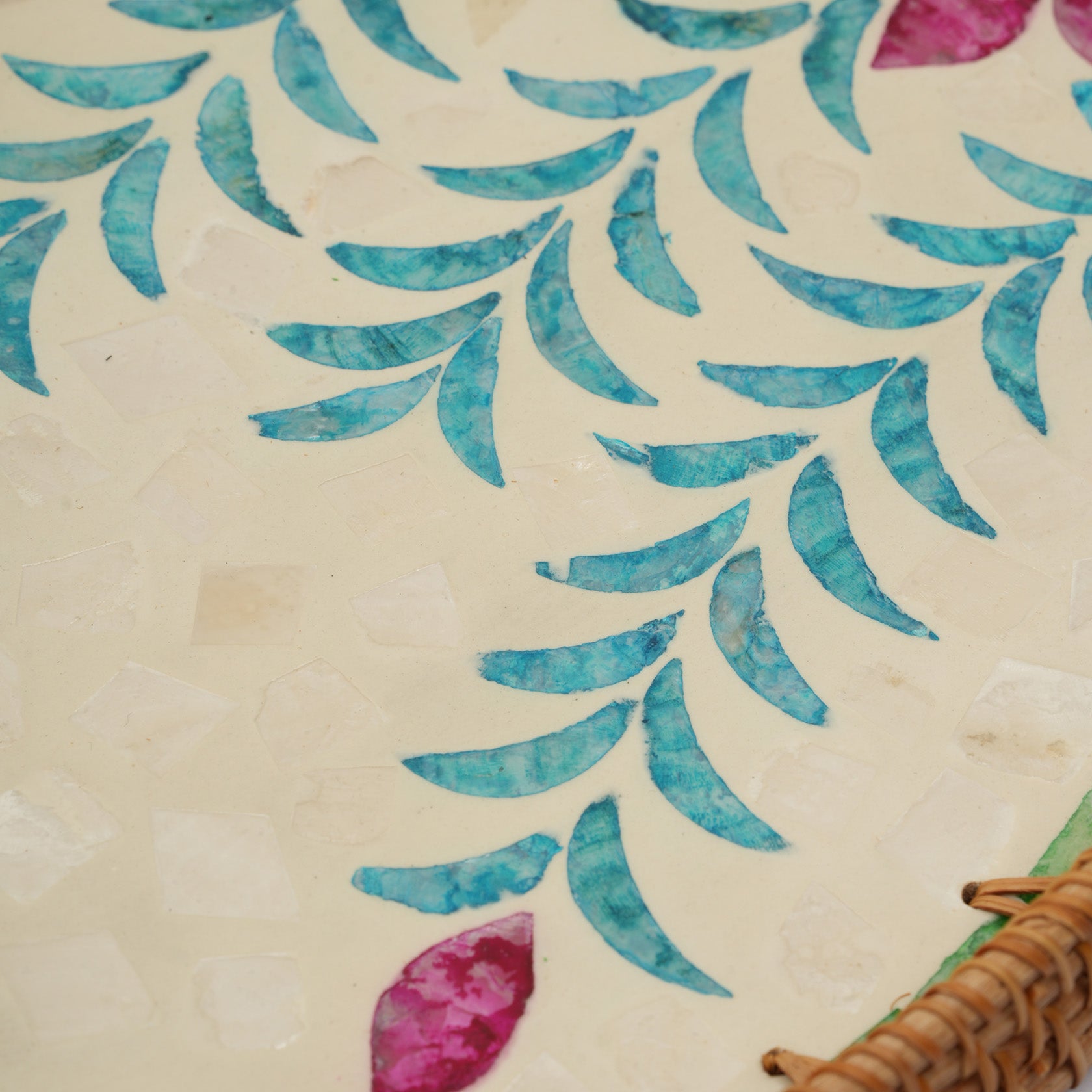 This delightful oval woven tray features an appealing natural border and a vibrant patterned base. The inlay showcases a pink and turquoise leaf mosaic, lending a fresh, tropical, and eye-catching aesthetic. Ideal for serving beverages or adding a colorful, bohemian accent to your living room décor or dining table.
